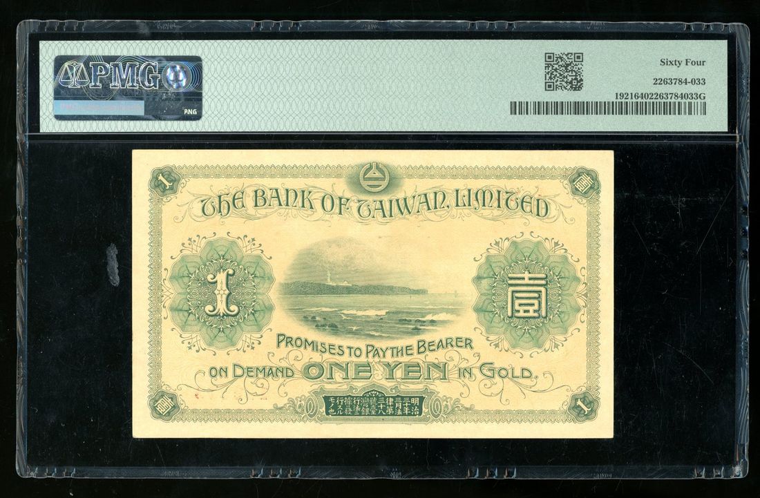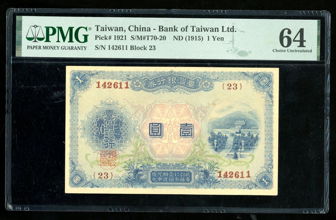 (x) Bank of Taiwan, 1 yen, ND (1915), serial number 142611, block 23, (Pick 1921), PMG 64. PMG census 2nd highest grade example