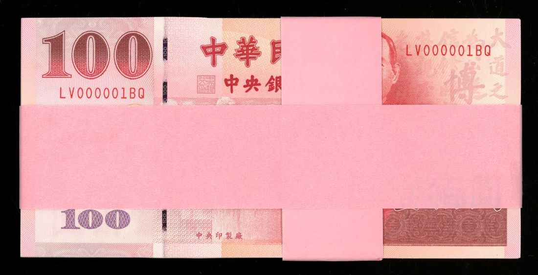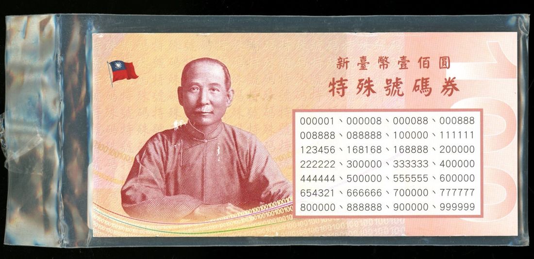 (x) Bank of Taiwan, a group of fancy serial numbers 100 yuan, Year 89 (2000), all with LV-BQ including, 000001, 000008, 000088, 000888, 008888, 088888, 888888, 100000, 111111, 123456, 168168. 168888, 200000, 222222, 300000, 333333, 400000, 444444, 50000, 55555, 600000, 654321, 666666, 700000, 777777, 800000, 900000, 99999,