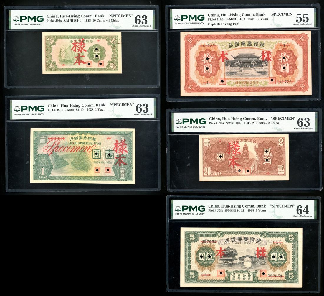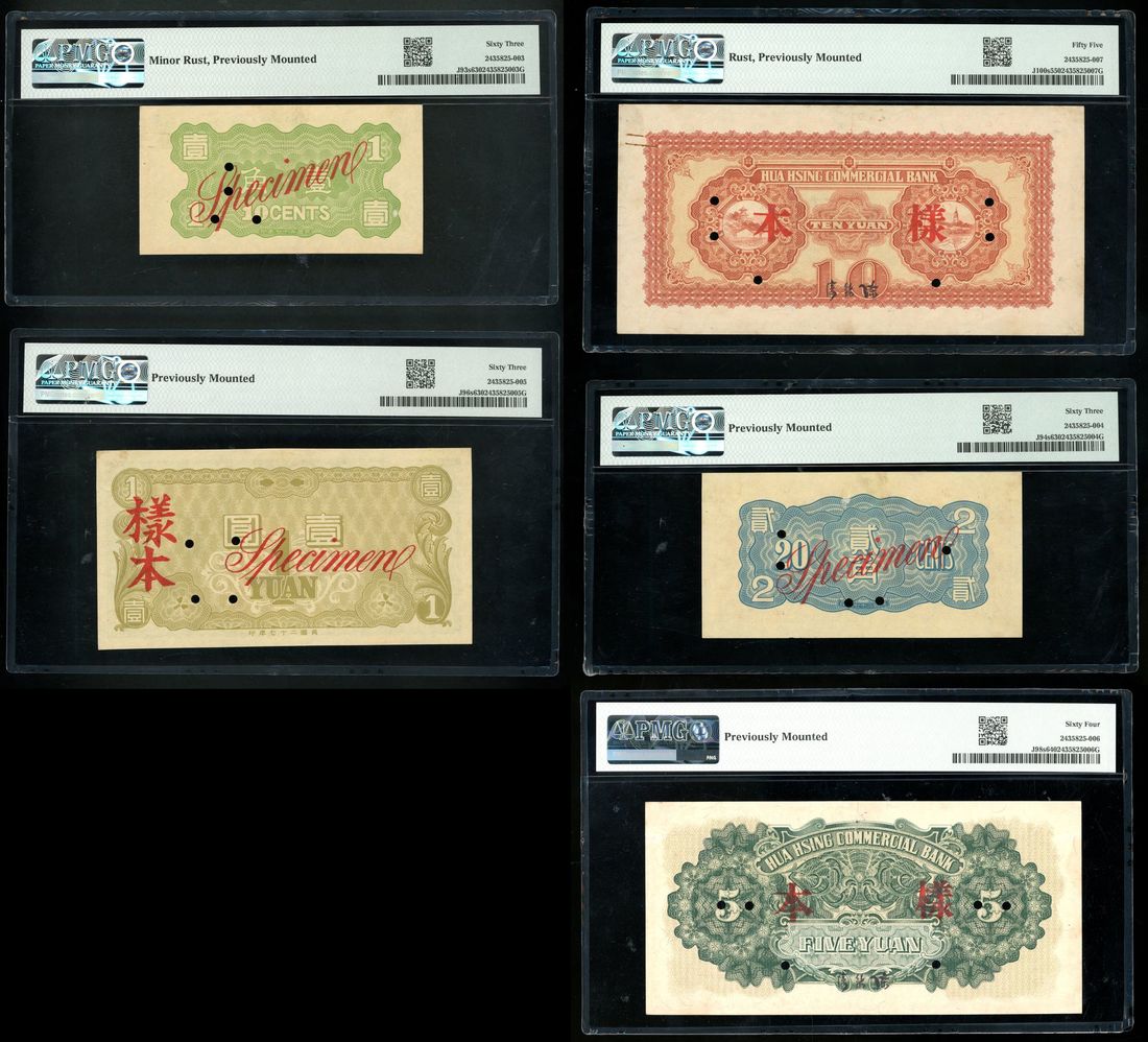 (x) Hua-Hsing Commercial Bank, China, a complete set of specimen, Year 27 (1938), including, 1 and 2 jiao, 1, 5 and 10 yuan, (Pick J93s, J94s, J96s, J98s, J100s), PMG 63 (minor rust), 63, 63, 64 and 55 (rust), all previously mounted. Not often seen as a full set (5)