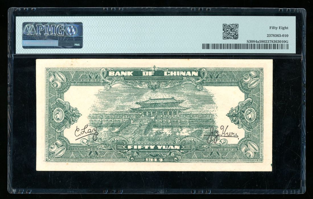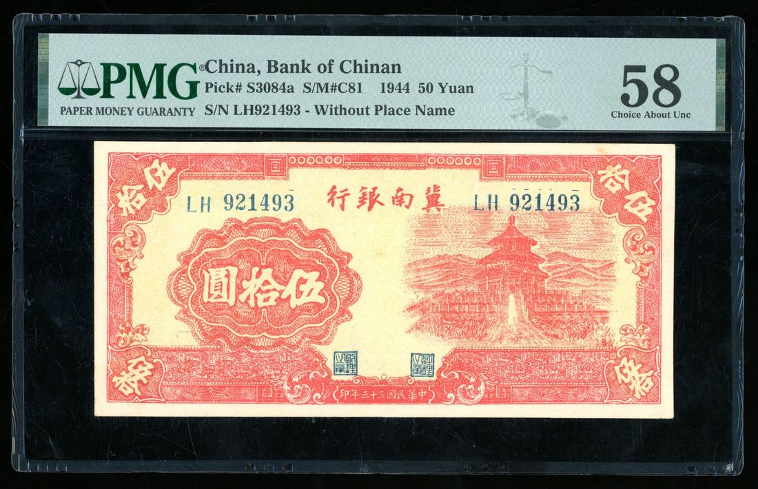 (x) Bank of Chinan, China, 50 yuan, Year 33 (1944), serial number LH 921493, (Pick S3084a), PMG 58, quite rare