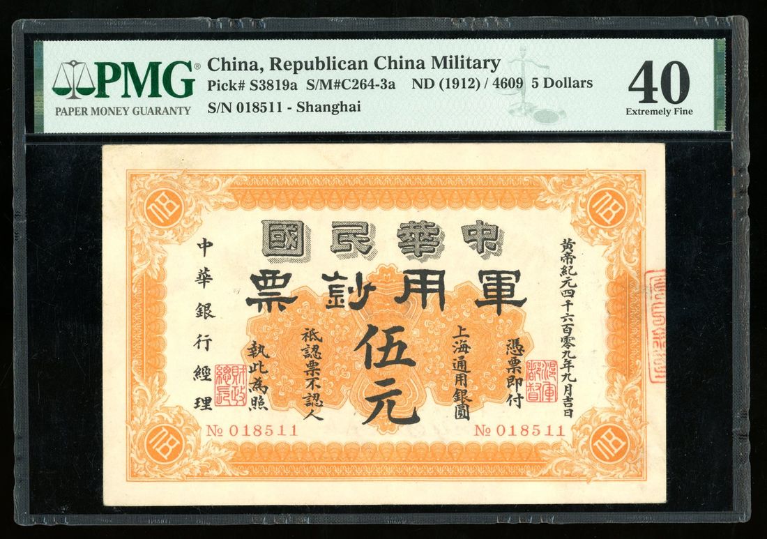 (x) Republican China Military, 5 yuan, Year 4609 (1912), Shanghai, serial number 018511, orange,