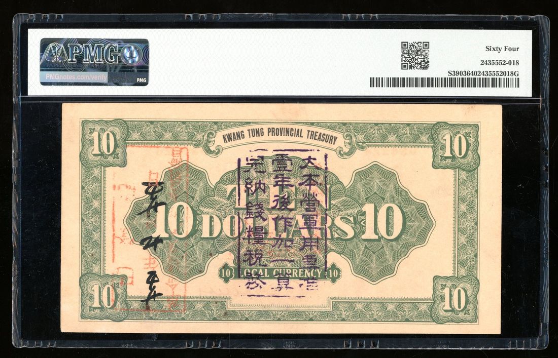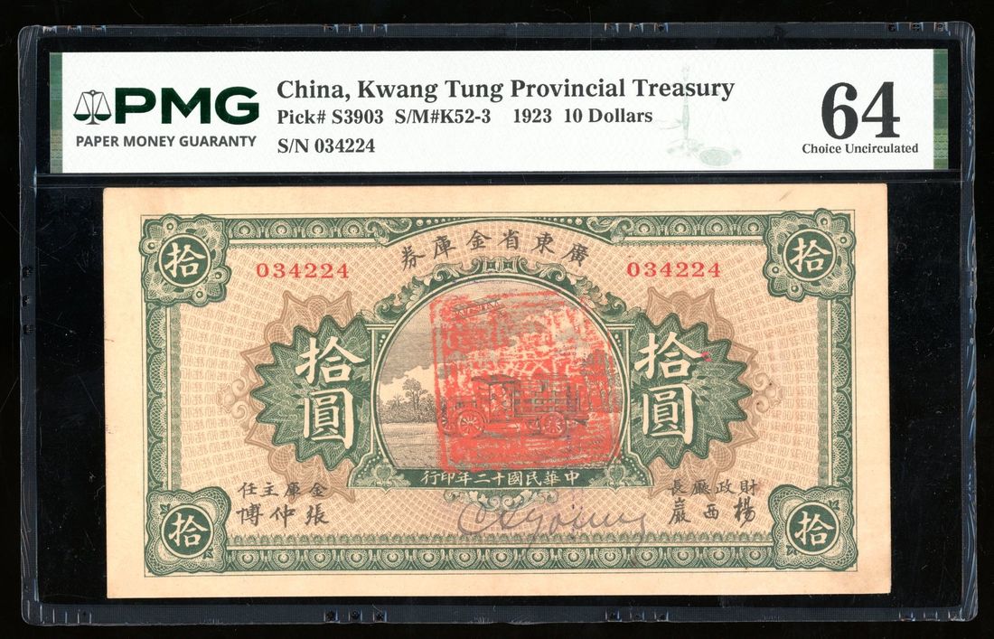 (x) Kwangtung Provincial Treasury, China, 10 yuan, Year 12 (1923), serial number 034224, with various stamps,