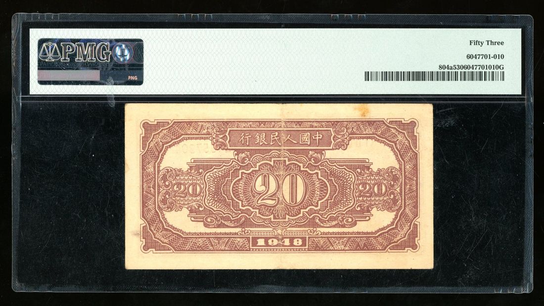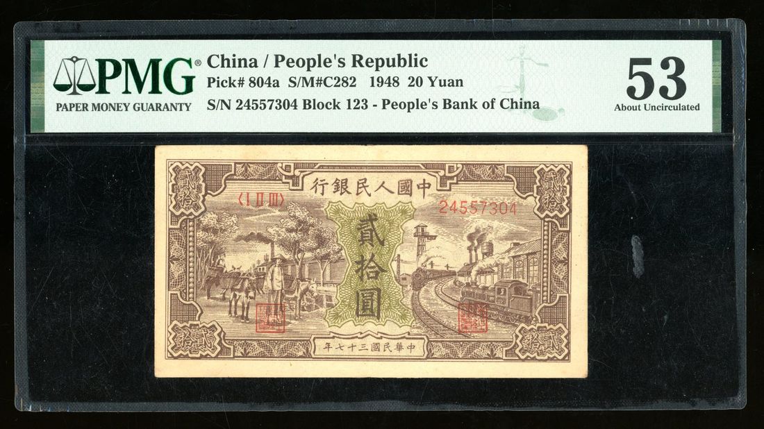 (x) People's Bank of China, 1st Series Renminbi, 1948, 20 yuan, serial number I II III 24557304, "donkey and train",
