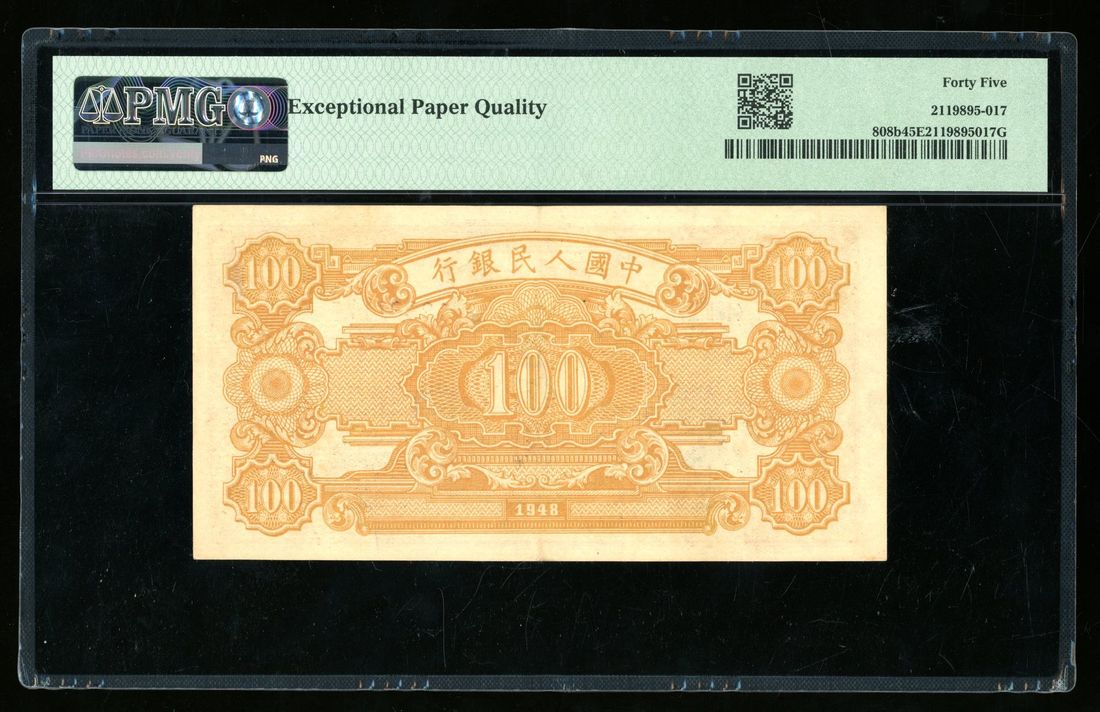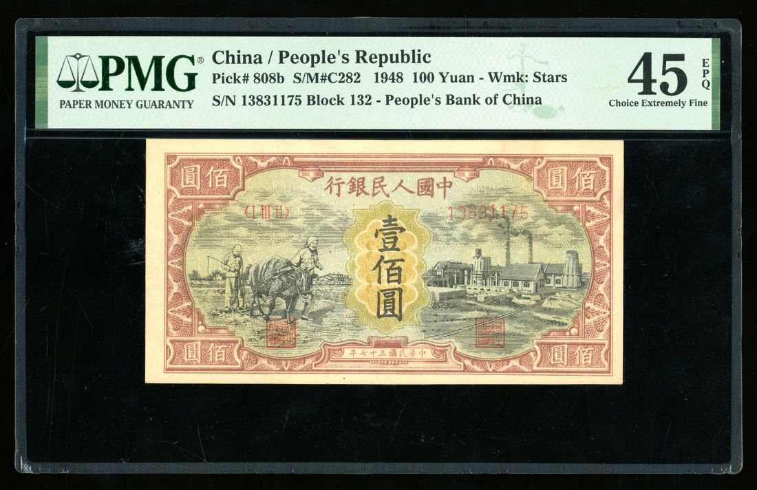 (x) People's Bank of China, 1st Series Renminbi, 1948, 100 yuan, serial number I III II 13831175, "ploughing and factory",