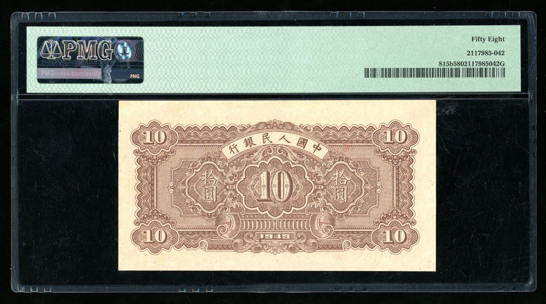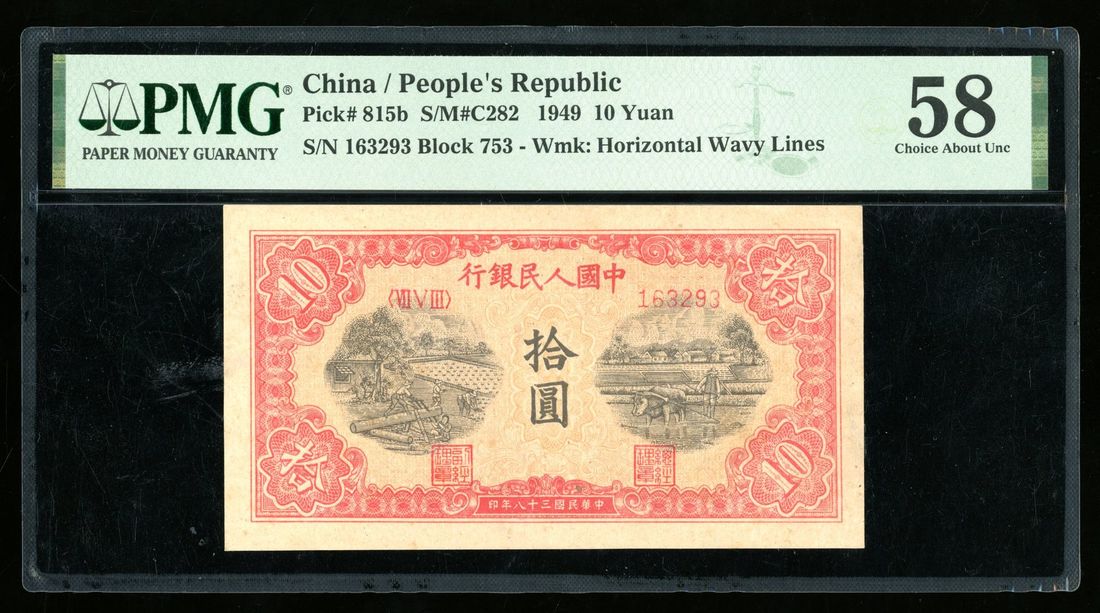 (x) People's Bank of China, 1st Series Renminbi, 1949, 10 yuan, serial number VI V III 163293, "ploughing and wood sawing" with horizontal wavy watermark,