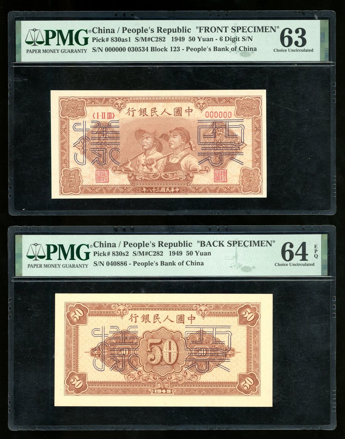 (x) People's Bank of China, 1st Series Renminbi, 1949, obverse and reverse specimen 50 yuan, specimen no. 30534, 40886, "farmer and factory worker",