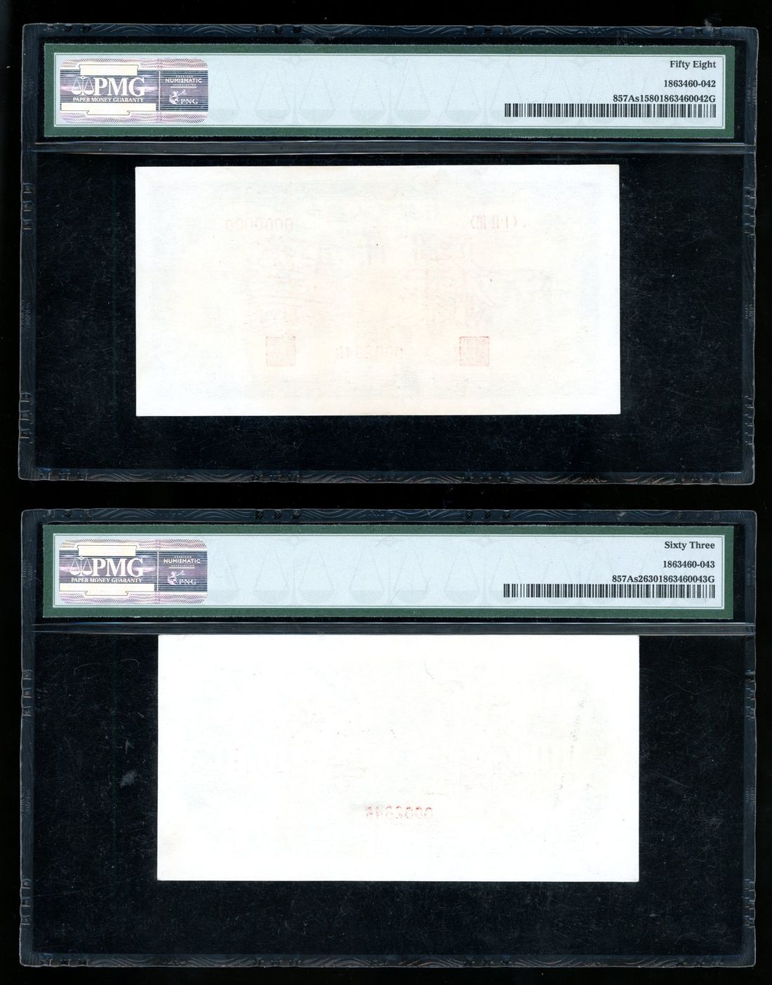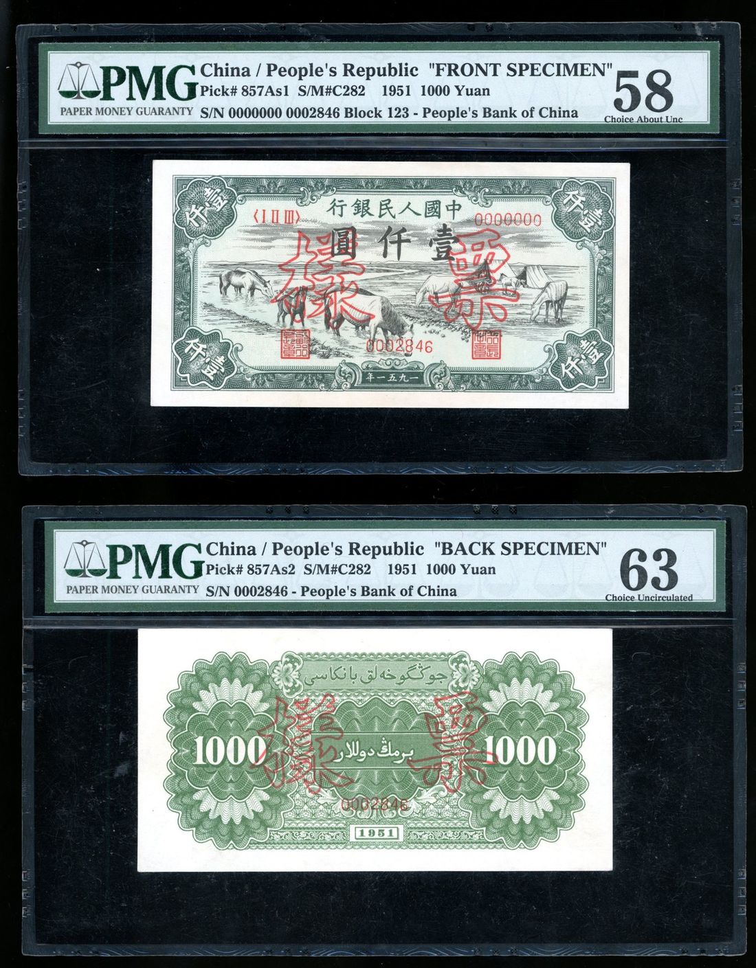 (x) People's Bank of China, 1st Series Renminbi, 1951, obverse and reverse specimen 1000 yuan, specimen numbers 0002846, (Pick 857As1/2), PMG 58 and 63 respectively. Matching pair without remarks quite rare (2)