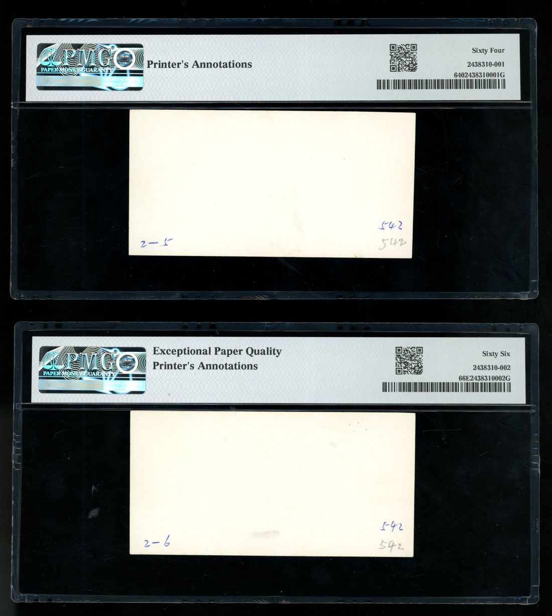 PMG 64 and 66EPQ respectively, both with printer's annotations. Interesting and theme highly fitting with then social sentiments (2)