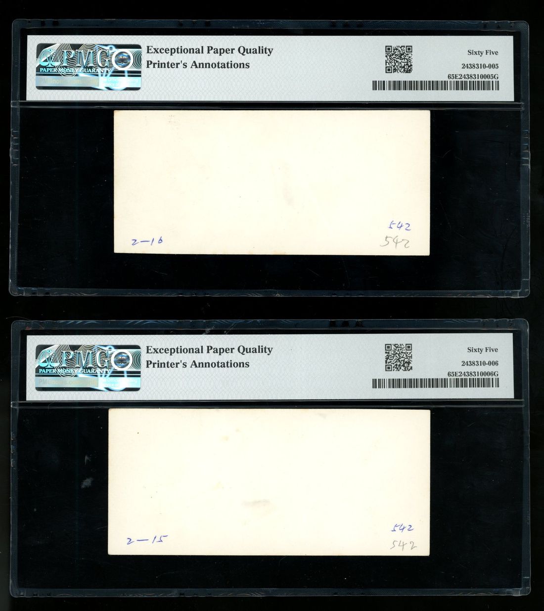 both PMG 65EPQ with printer's annotations. Interesting and theme highly fitting with then social sentiments (2)