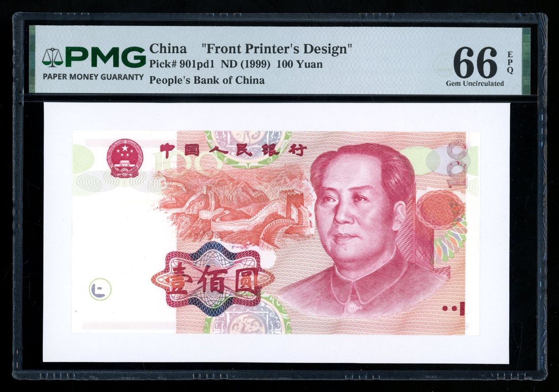 (Pick 901pd1), PMG 66EPQ. An unissued design with picture of the Great Wall at centre that is not on the issued note. An early design for the 100 yuan. Extremely rare. Important for any Chinese banknote collectors