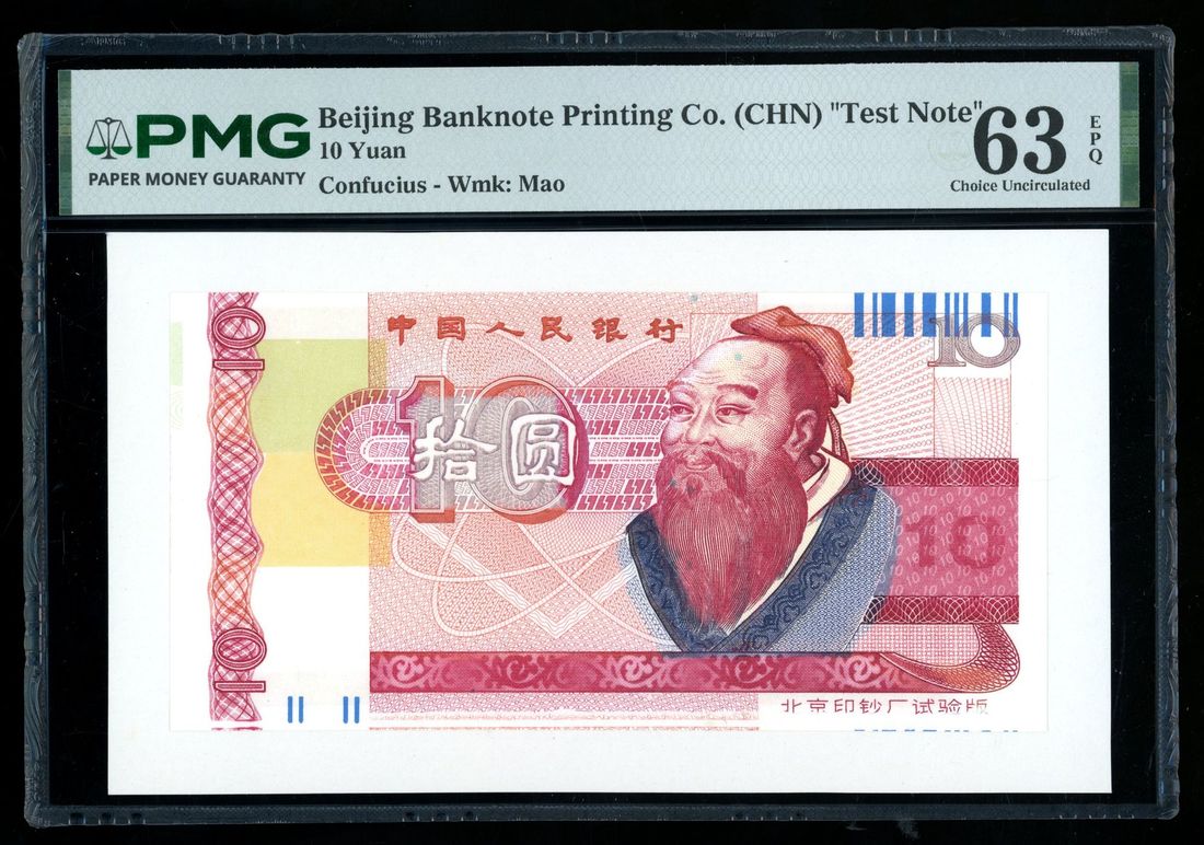 (Pick unlisted), PMG 63 EPQ, a ever scarce and sought after 'Confucius' 10 yuan test note in an attractive and auspicious red design!