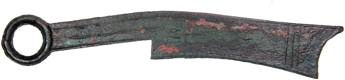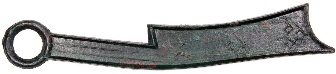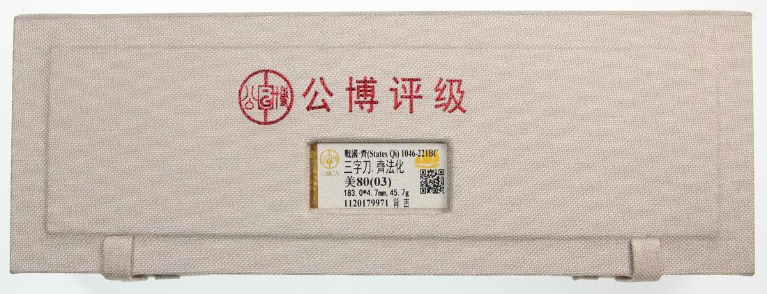 China, Warring States period, [GBCA 80] bronze knife money, 378-324 B.C., from the State of Qi, Chinese characters 'Qi Fa Hua' on obverse, 'Ji' on reverse, 183.0x4.7mm, weighs 45.7g, Repaired, Cert. #1120179971. 'Ji' on reverse being one of the less common types