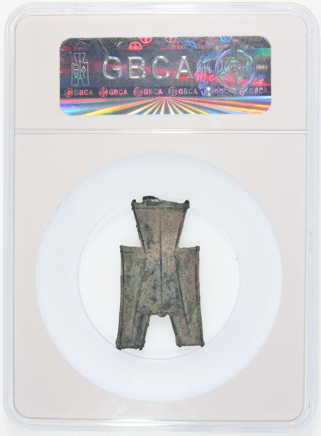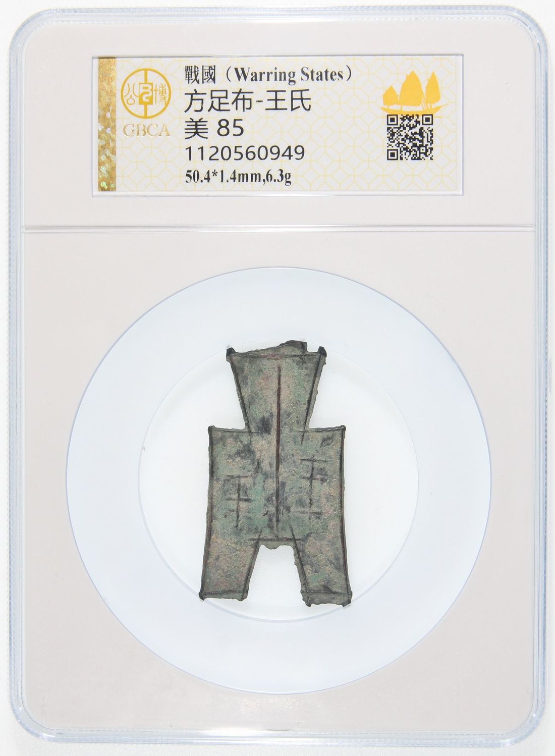 (x) China, Warring States Period, [GBCA 85] bronze square foot 'Bu' coin, circa 476-225 B.C., from the State of Wei, Chinese characters 'Wang Shi' (in modern day Shansi Province) on obverse, 50.4x1.4mm, weighs 6.3g. A pleasant example