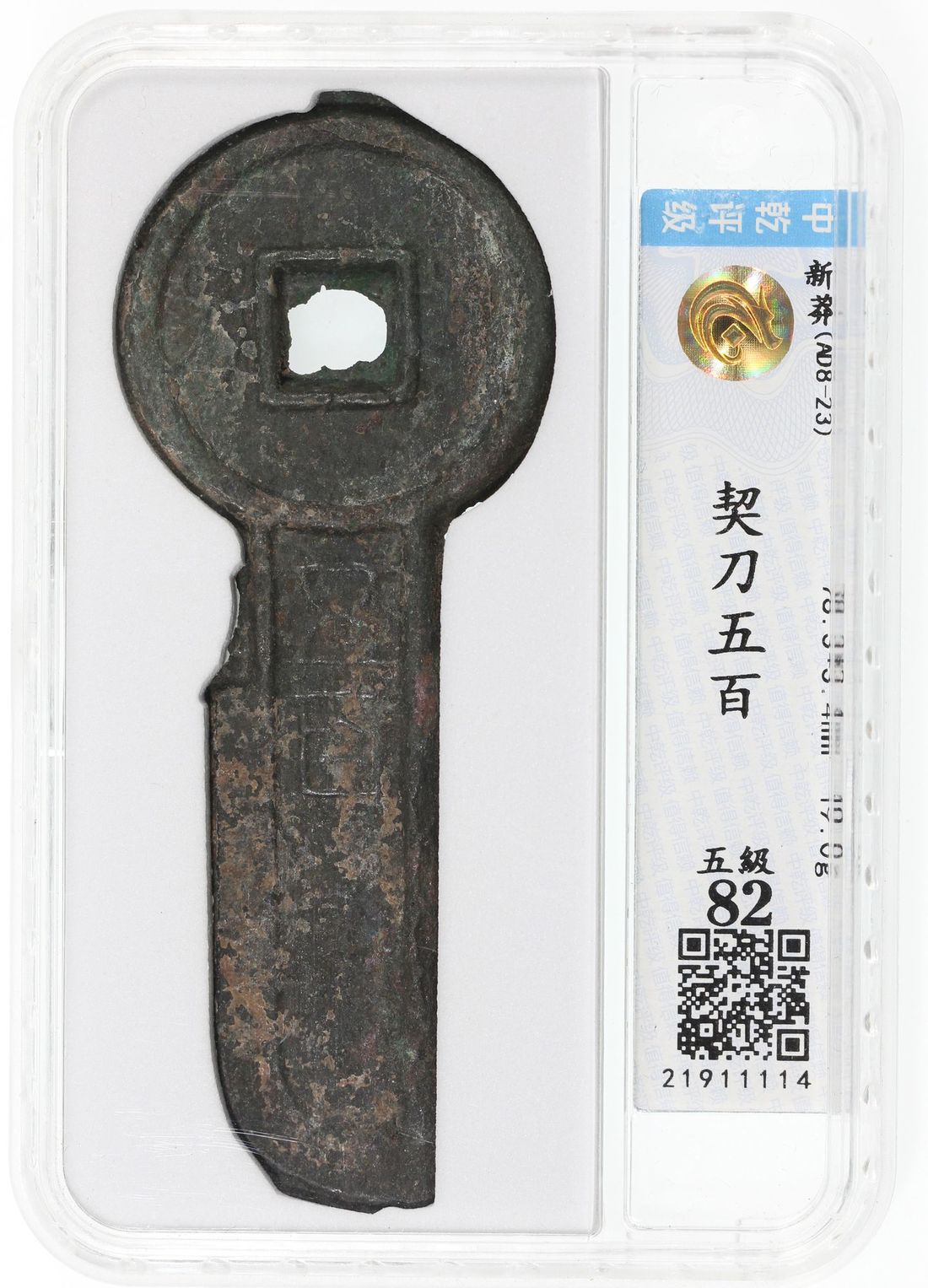 (x) China, Western Han / Xin Dynasty, [Zhong Qian 82] bronze knife money, 'Qi Dao Wu Bai ', A.D. 7, minted during Huang Meng's first currency reform, 78.3x3.4mm, weighs 19.0g, 'Qi Dao Wu Bai' means one knife is the equivalent of 500 Wuzhu coins. A well preserved example, scarce