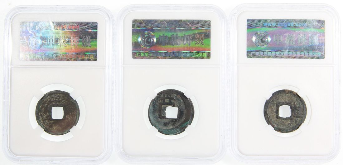 (x) China, Tang Dynasty, [Zhong Qian 80-82] a trio of 'Kai Yuan Tong Bao', 845, Hui Chang type, including: 'Gui' on reverse at right quadrant for Guilin mint (Kwangsi Province); 'Dan' on reverse at upper quadrant for Danzhou mint (Shensi Province); 'Ping' on reverse at upper quadrant for Pingzhou mint (Chihli Province); 'Gui', 'Ping', and 'Dan' are generally considered as key types and these three are in very respectable condition (3)