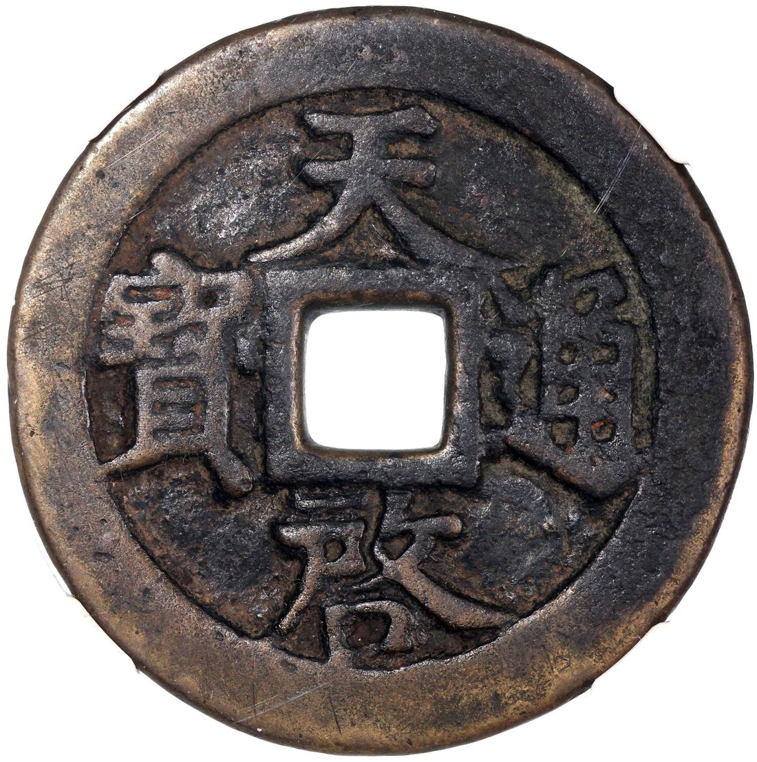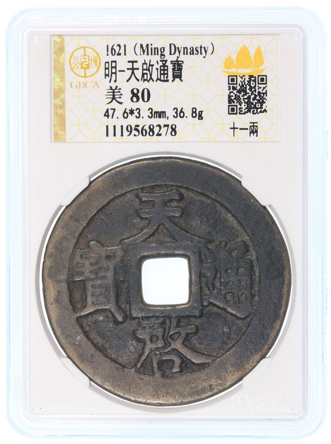 (x) China, Ming Dynasty, [GBCA 80] brass 10 cash, 'Tian Qi Tong Bao', 1622-1625, 'Shi Yi Liang' on reverse, 47.6x3.3mm, weighs 36.8g. The 10 cash type was only casted for less than 3 years due to the excessive amount and inferior quality from both local official and private mints.