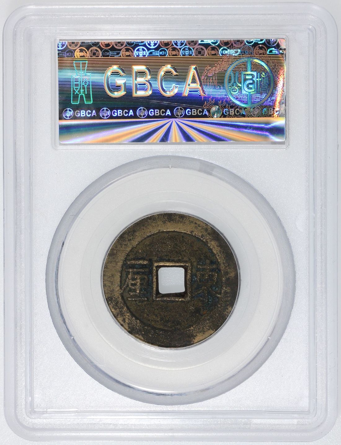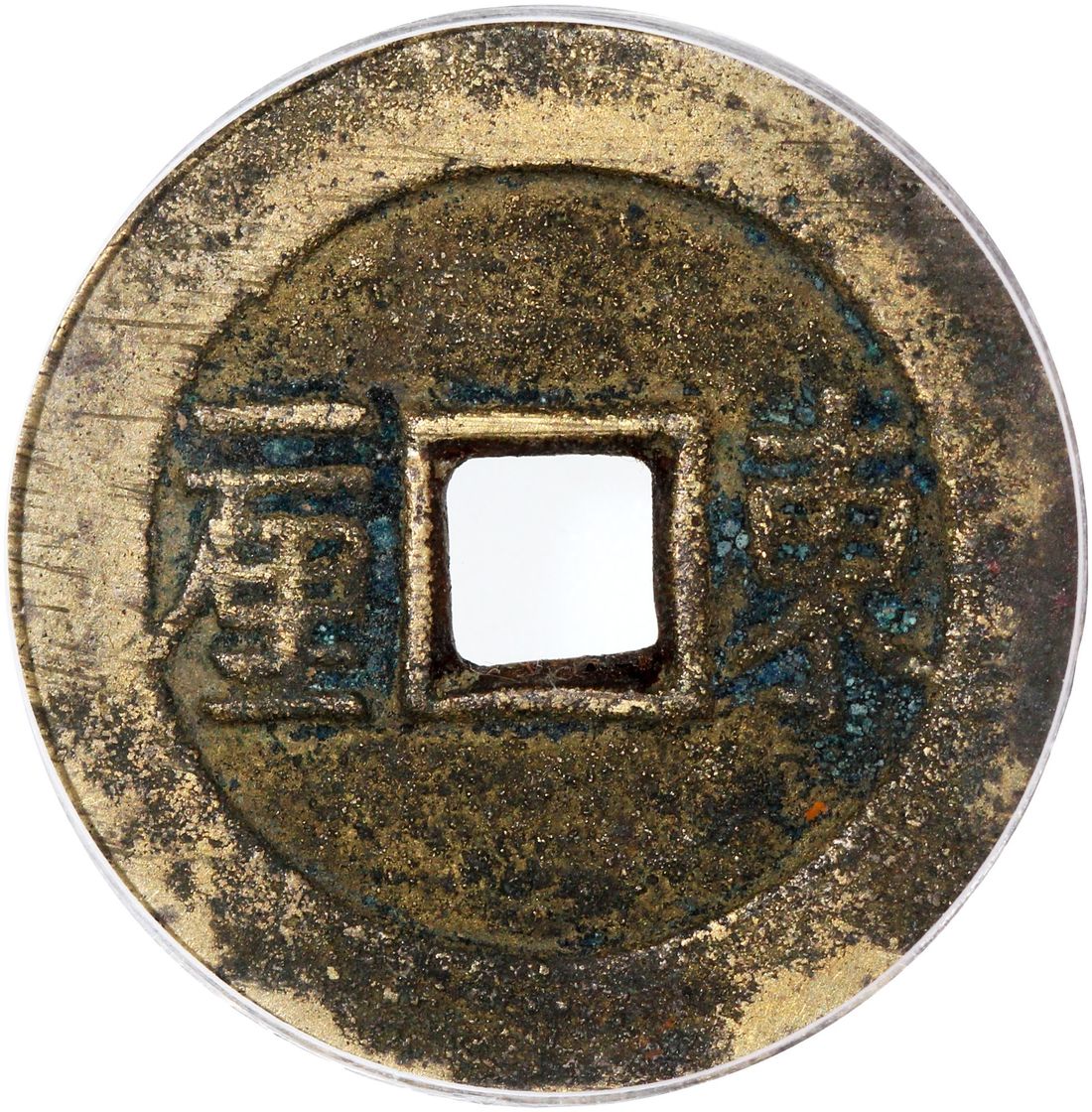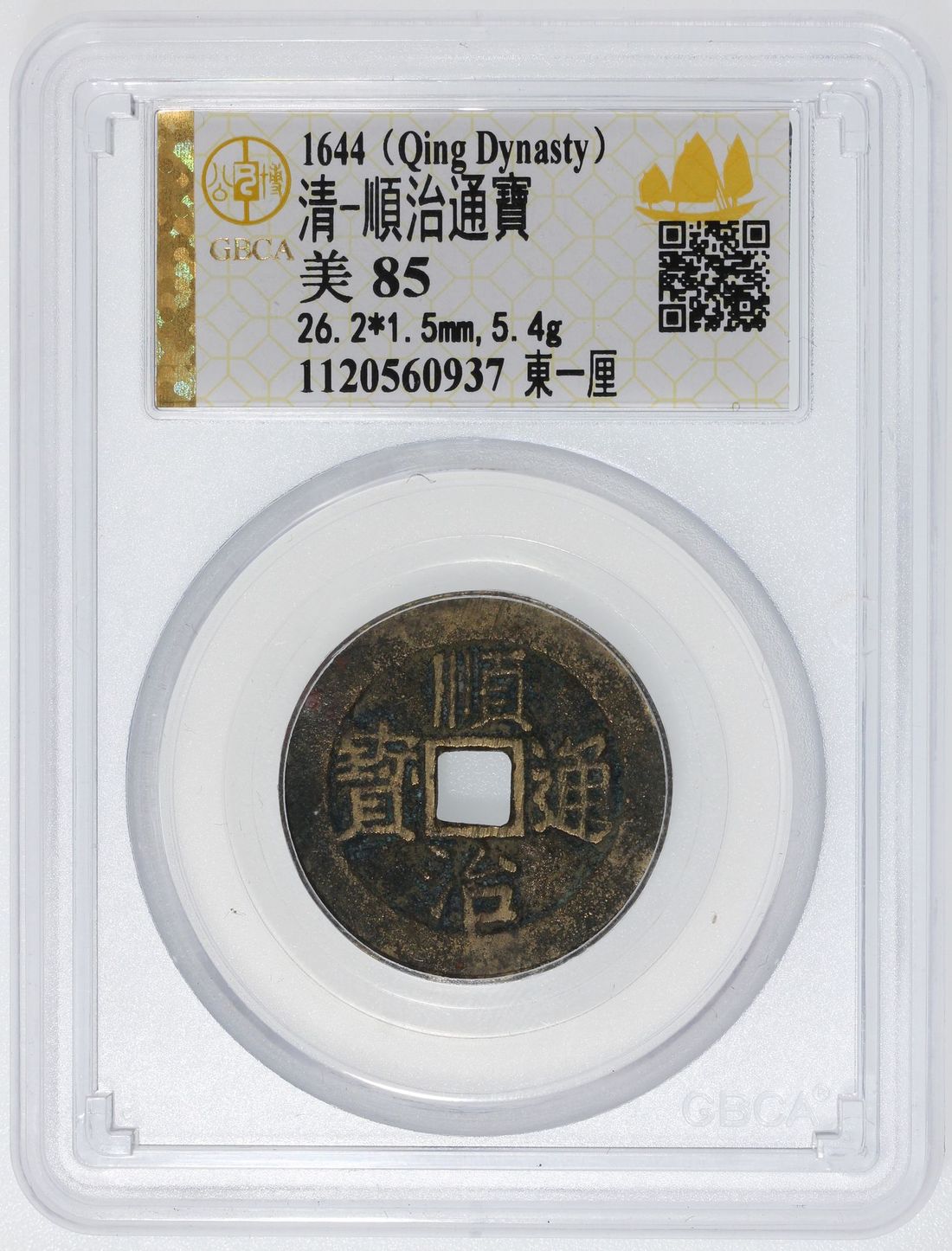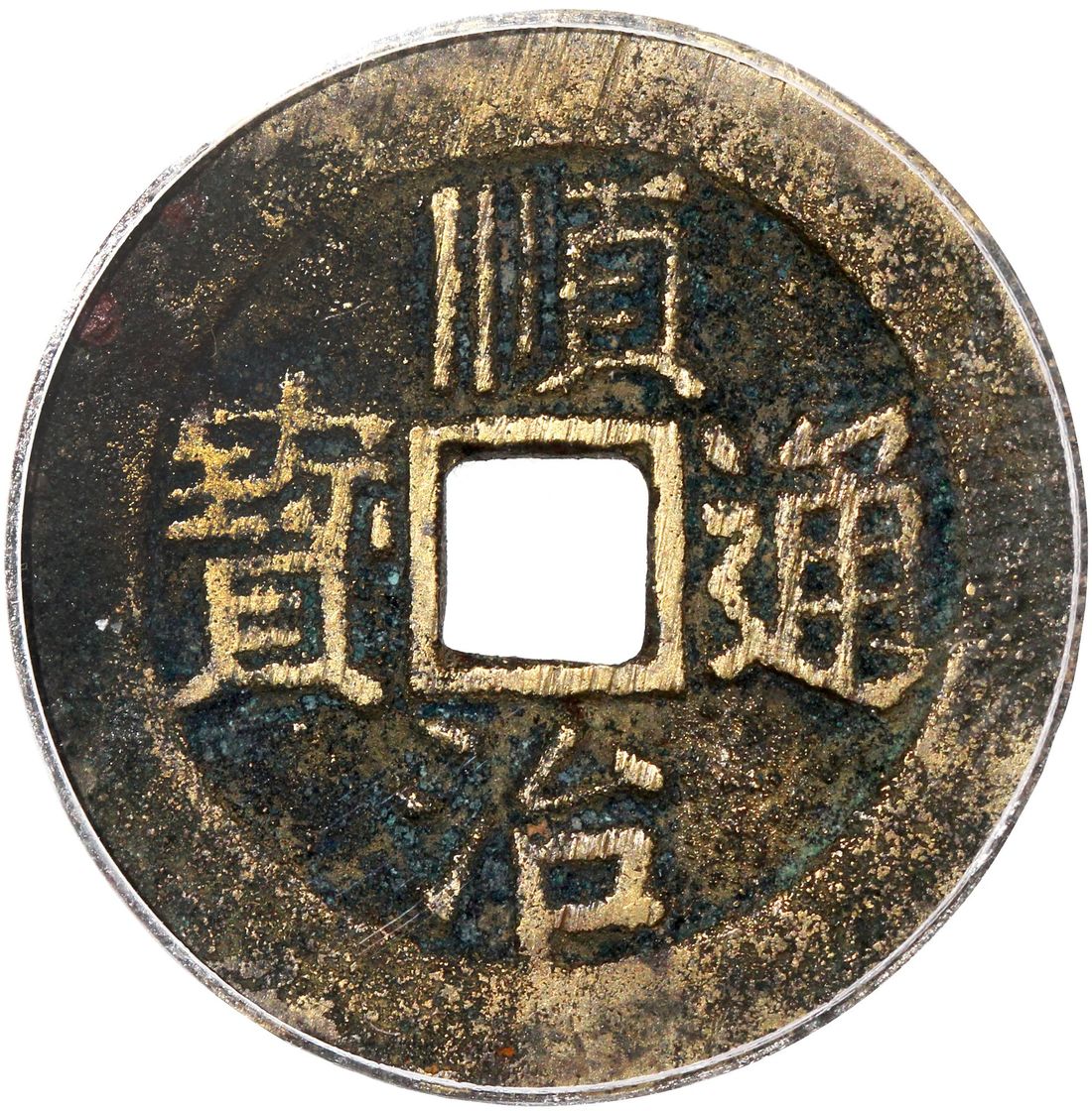 (x) China, Qing Dynasty, [GBCA 85] brass cash coin, 'Shun Zhi Tong Bao', 1653-1657, 3rd era type with Chinese characters 'Yi Li' on reverse at left quadrant, 'Dong' at right for Dongchang mint, 26.2x1.5mm, weighs 5.4g