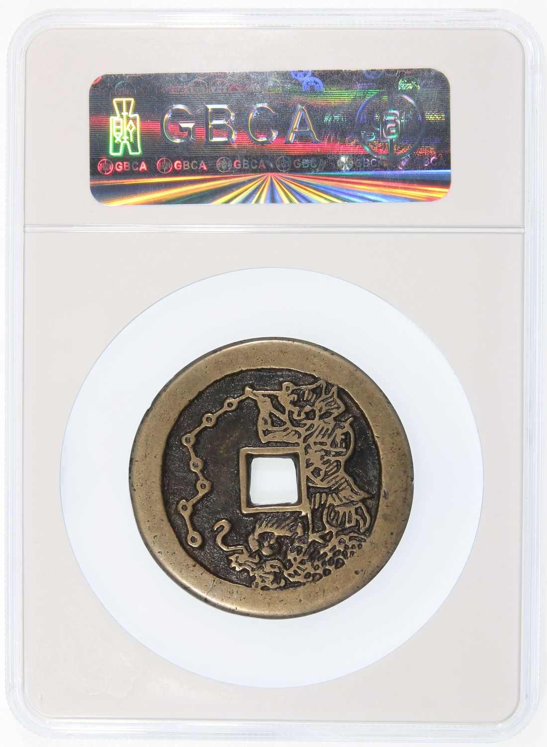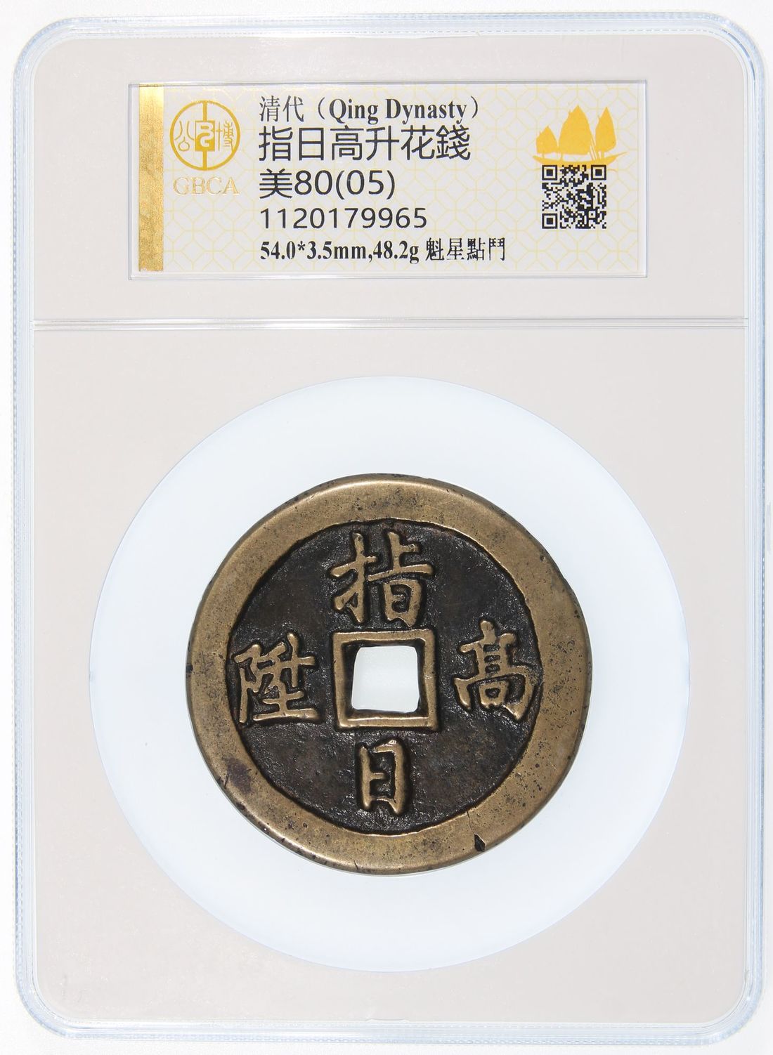 China, Qing Dynasty, [GBCA 80] coin-shaped charm with square central hole, obverse inscribed 'Zi Ri Gao Sheng', scene of God of Examinations Pointing at the Dipper on reverse, 54.0x3.5mm, weighs 48.2g Cracked