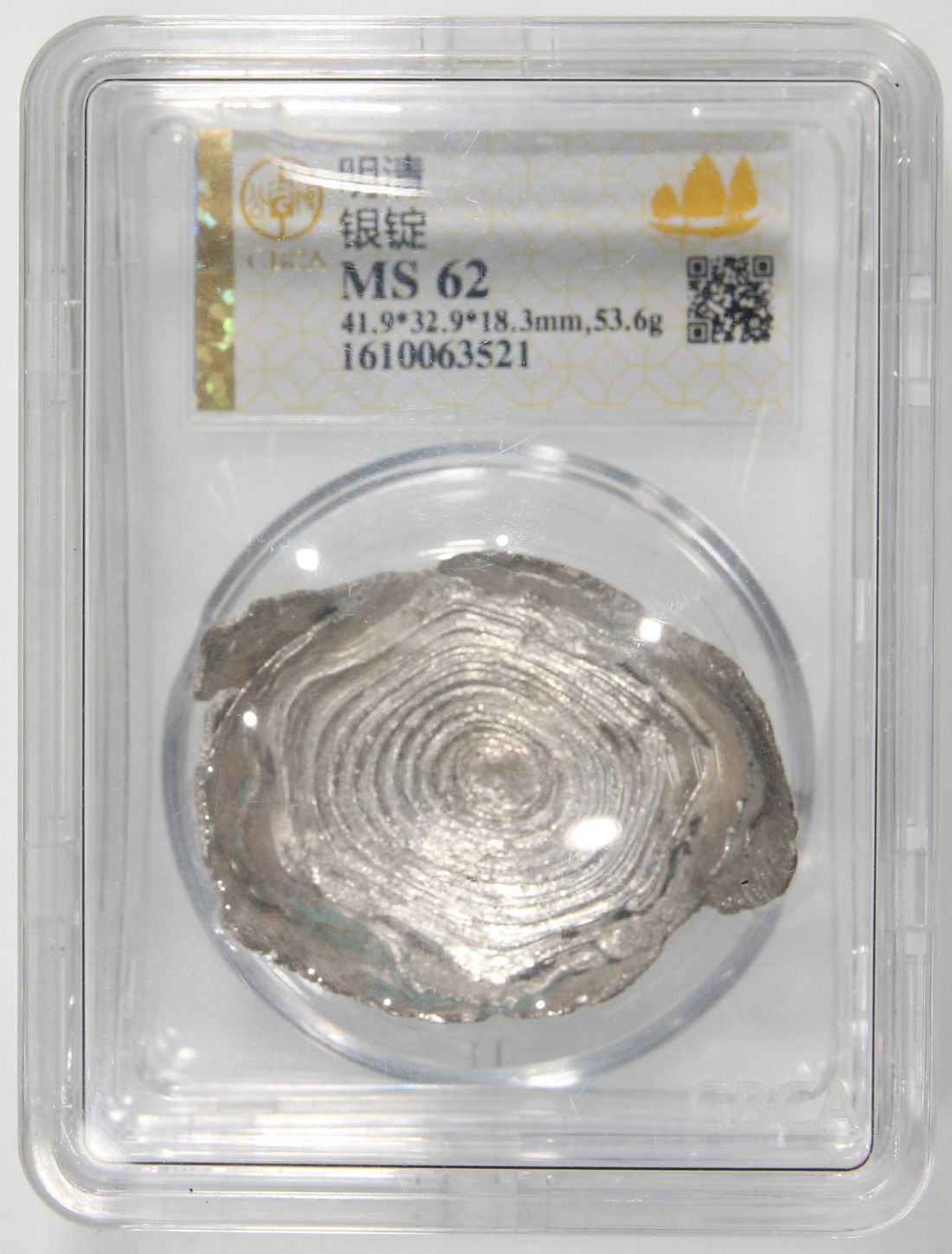 (x) China, Ming/Qing Dynasty, [GBCA MS62] silver sycee, 41.9 x 32.9 x 18.3mm, 53.6g,