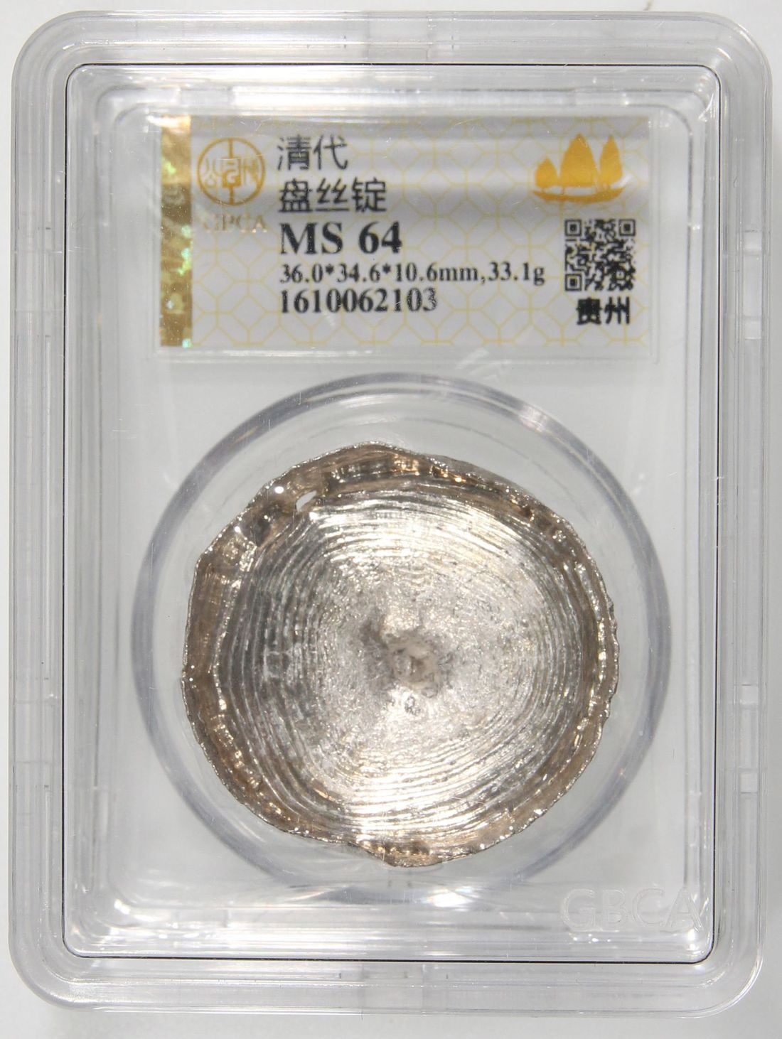 (x) China, Qing Dynasty, Kweichow Province, [GBCA MS64] radial silver sycee, 36 x 34.6 x 10.6mm, 33.1g,