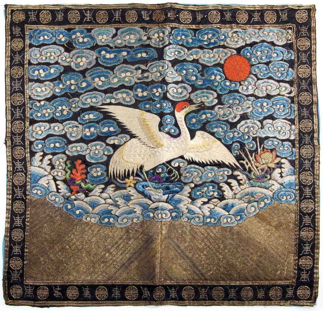 (x) China, Qing Dynasty, a set of 'Kesi' silk Crane Rank Badges for the 1st rank civil official, including back badge and split front badge, both back and front badges with identical pattern, size 30.5x32cm. The phoenix symbolizes the empress, while the crane ranks second only to the phoenix among auspicious birds and has long represented the highest official rank. This rank badge retains magnificent colours and intricate gold thread work, with the crane vividly depicted. Though a few threads are loose, it is rarely seen in a complete front and back set. Minor imperfections do not diminish its exceptional charm