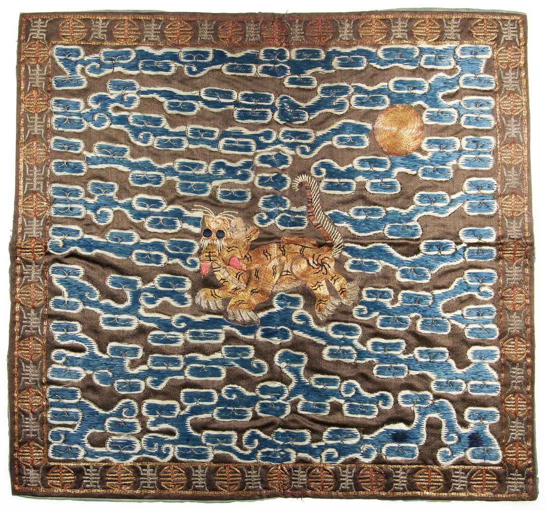(x) China, Qing Dynasty, a 'Kesi' silk Tiger Rank Badge for 4th rank military court, back badge, size 28.5x 30.5cm. During the Qing dynasty, the fourth-rank tiger rank badge was worn by officials such as Second-Class Imperial Bodyguards, Company Commanders, Superintendents of the Southern Hunting Park, Chief Palace Eunuchs, District Commanders, and Assistant Regional Commanders. This fine example is superbly preserved - the 'Wang' (King) character on the tiger’s forehead is well defined, and the tiger’s body is intricately worked with golden threads. The portrayal is both majestic and vividly executed, conveying great power and dignity