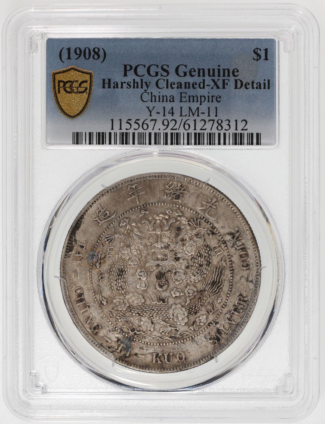 (x) China, Qing Dynasty, [PCGS XF Detail] silver dollar, ND (1908), 'Guang Xu Yuan Bao', Central Mint, (KM-Y-14, LM-11), Harshly Cleaned, Cert. #61278312