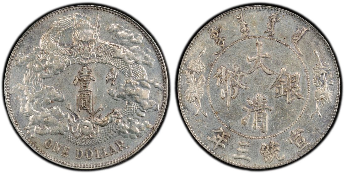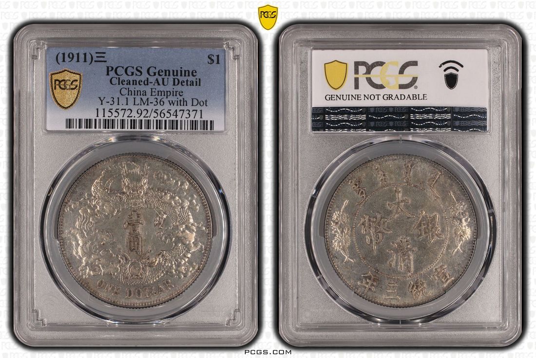 (x) China, Qing Dynasty, [PCGS AU Detail] silver dollar, 3rd year of Xuan Tong (1911), 'Da Qing Yin Bi', (LM-36, KM-Y-31.1), Cleaned, Cert. #56547371, the much rarer variety of this final year issue from the Qing Dynasty