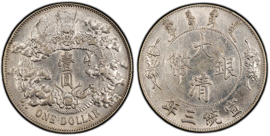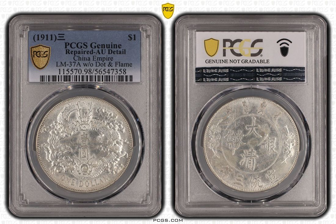 (x) China, Qing Dynasty, [PCGS AU Detail] silver dollar, 3rd Year of Xuantong (1911), 'Da Qing Yin Bi', without dot and no extra flame variety, (LM-37A, K-227), Repaired, Cert. #56547358