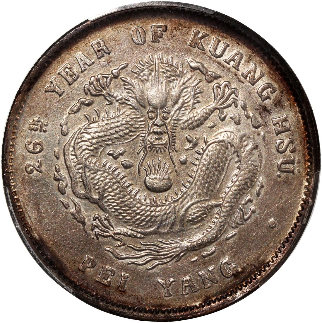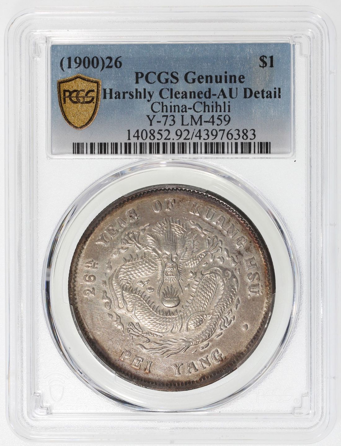 (x) China, Qing Dynasty, Chihli Province, [PCGS AU Detail] silver dollar, 26th Year of GuagnXu (1900), (LM-459), harshly cleaned. #43976383. A much scarcer date for this Chihli issue. Though graded as harshly cleaned, otherwise with only very minor nick at reverse and no other discernible signs of circulation. Any about uncirculated or better examples for this type extremely rare