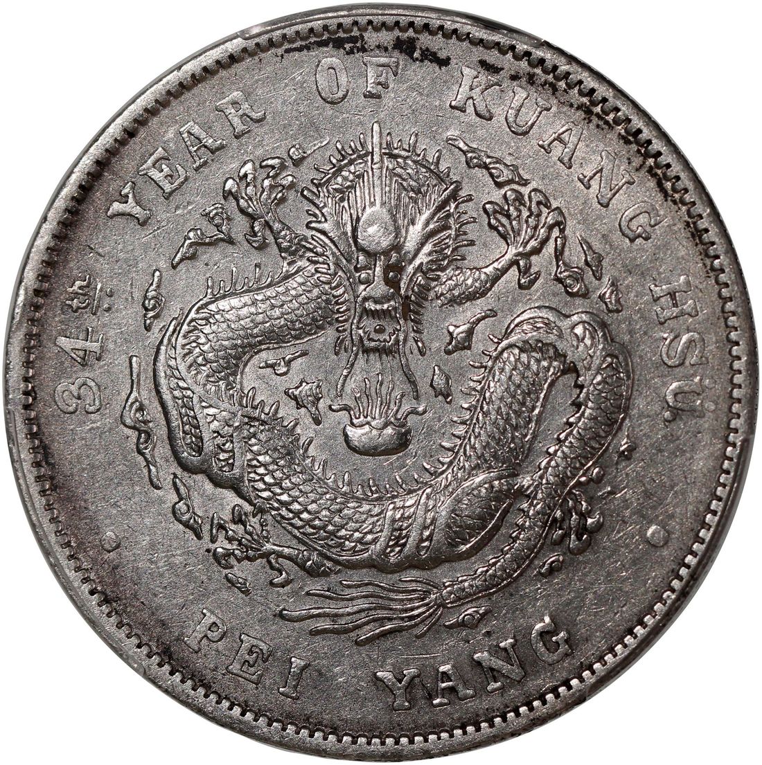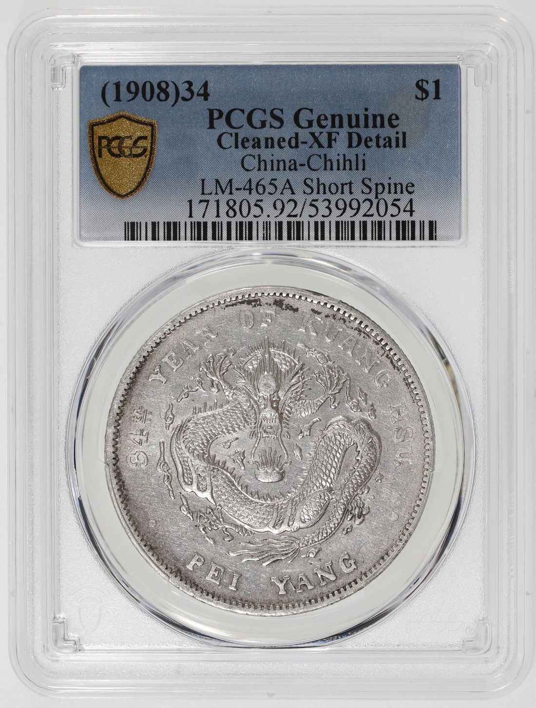 (x) China, Qing Dynasty, Chihli Province, [PCGS XF Detail] silver dollar, 34th year of GuangXu (1908), 'Guang Xu Yuan Bao', the scarcer short spine on tail variety, (LM-465A, KM-Y-73.3), Cleaned, Cert. #53992054