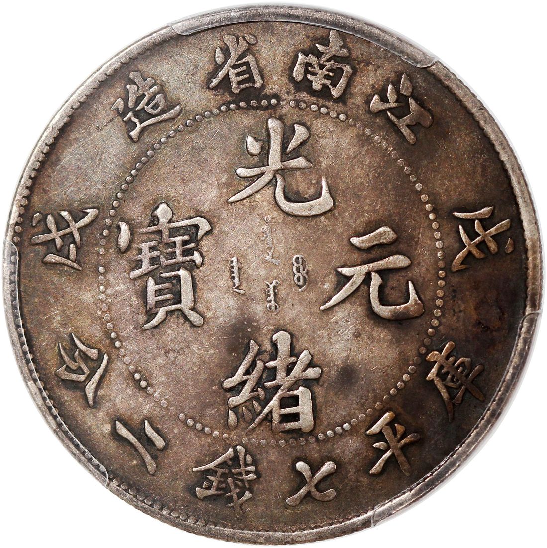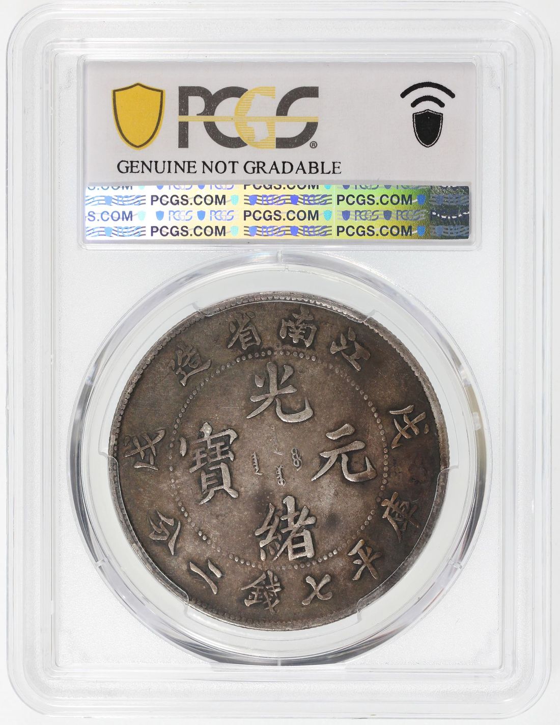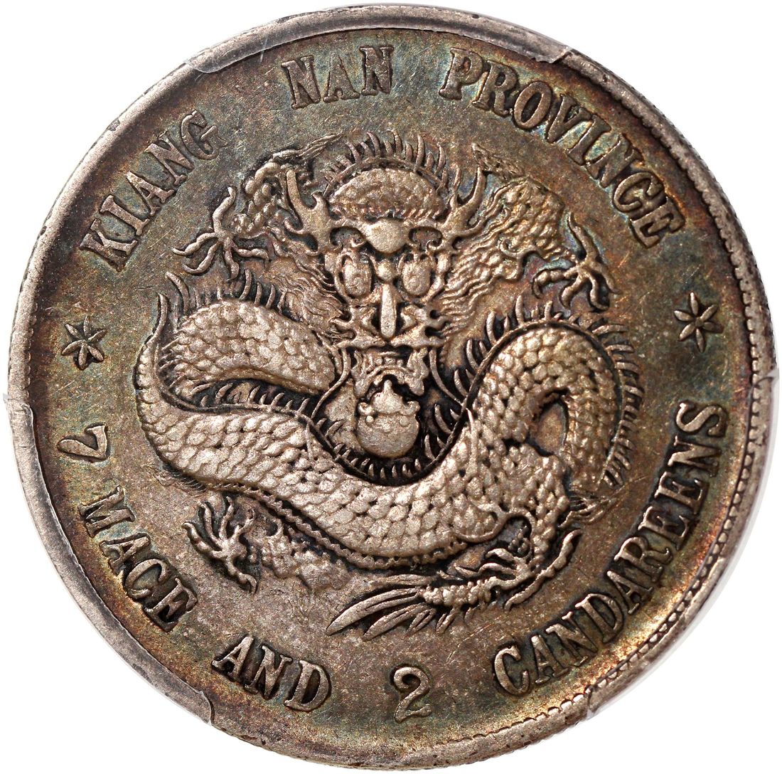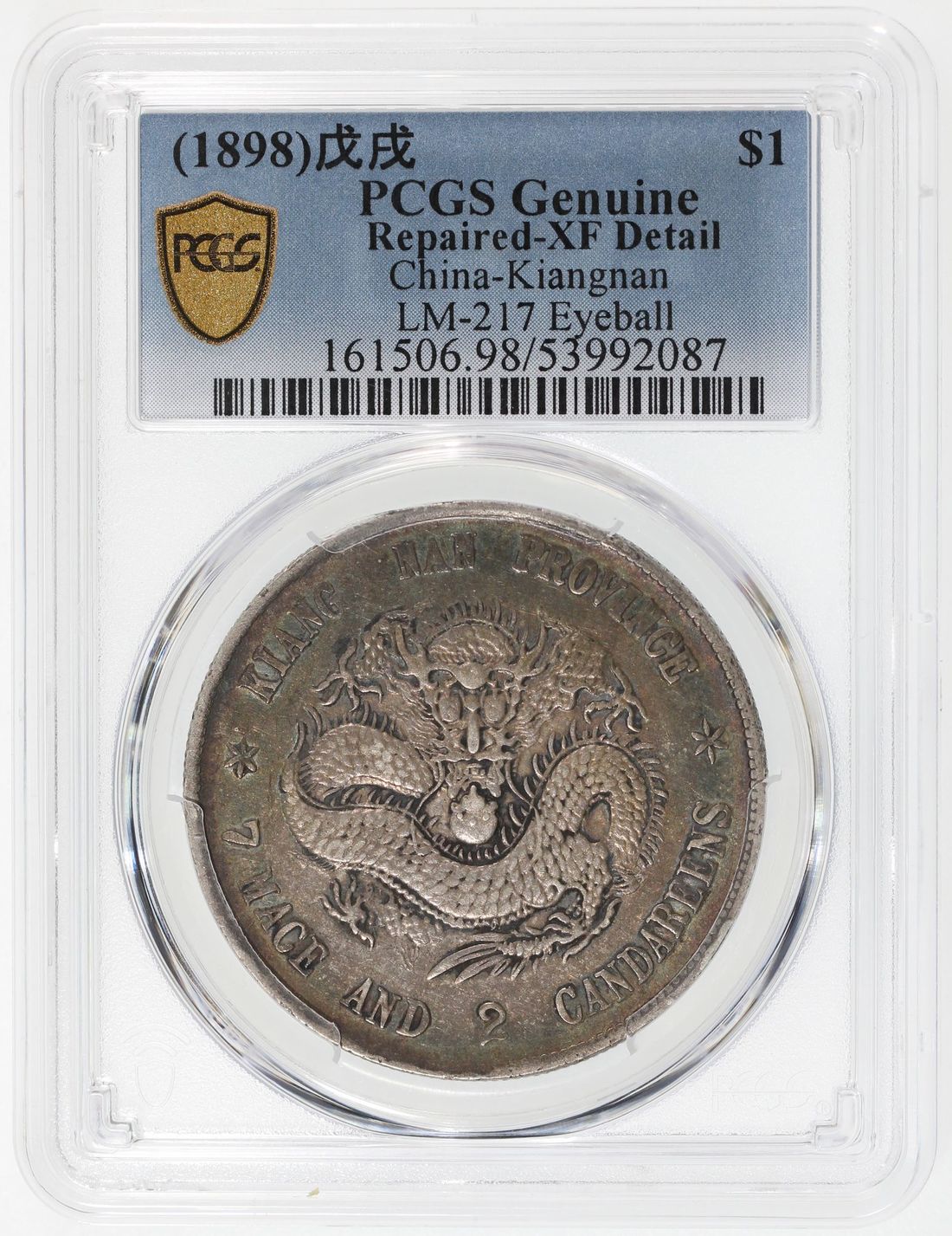 (x) China, Qing Dynasty, Kiangnan Province, [PCGS XF Detail] silver dollar, Wuxu year (1898), 'Guang Xu Yuan Bao', variety with dragon's eyeballs in relief, (LM-217, K-71), Repaired, Cert. #53992087. Despite it being repaired, the Kiangnan Old Dragon dollars are always popular among collectors, with the present example displaying an appealing viridian tones