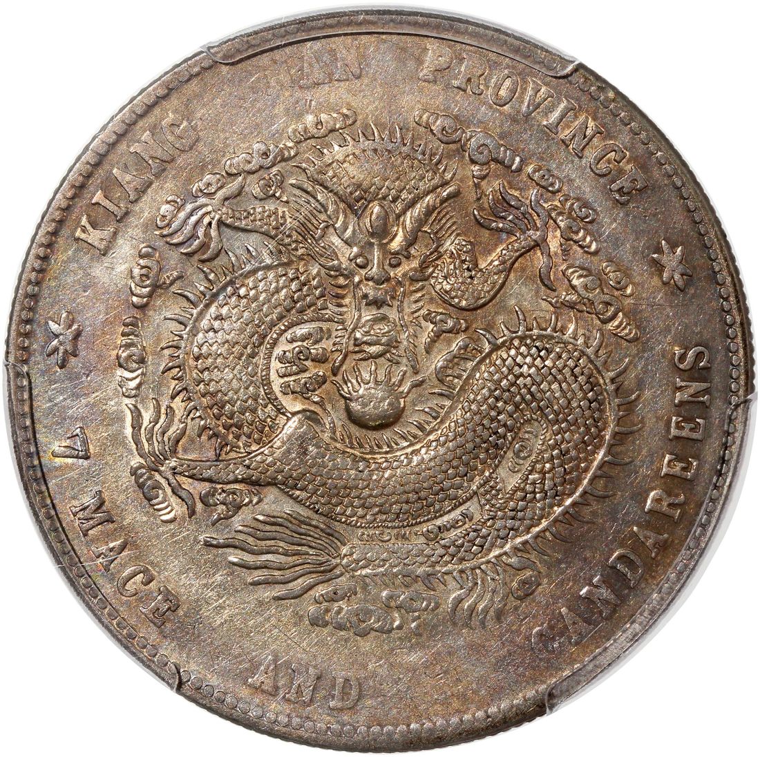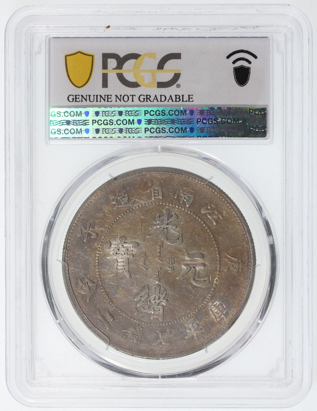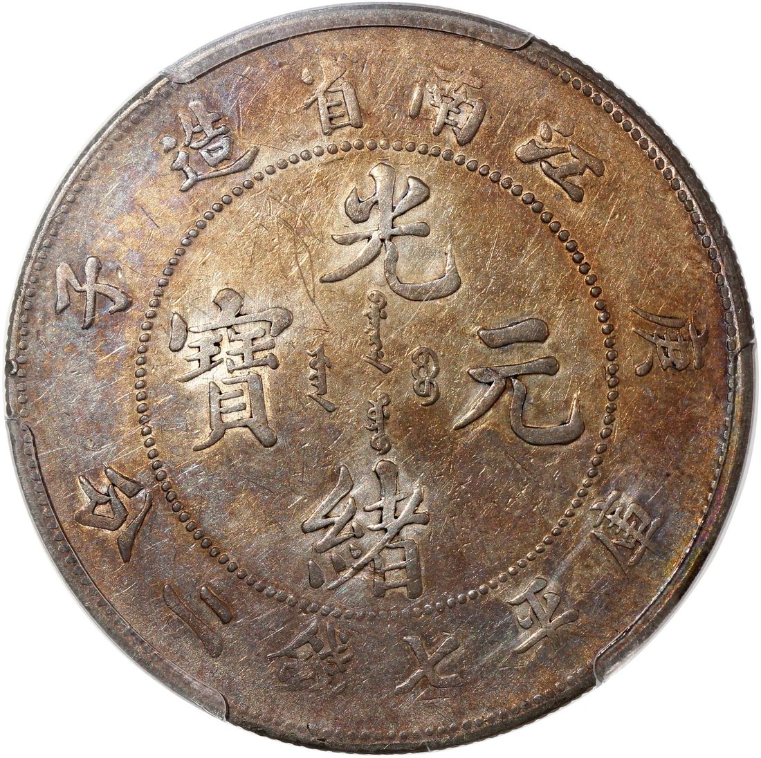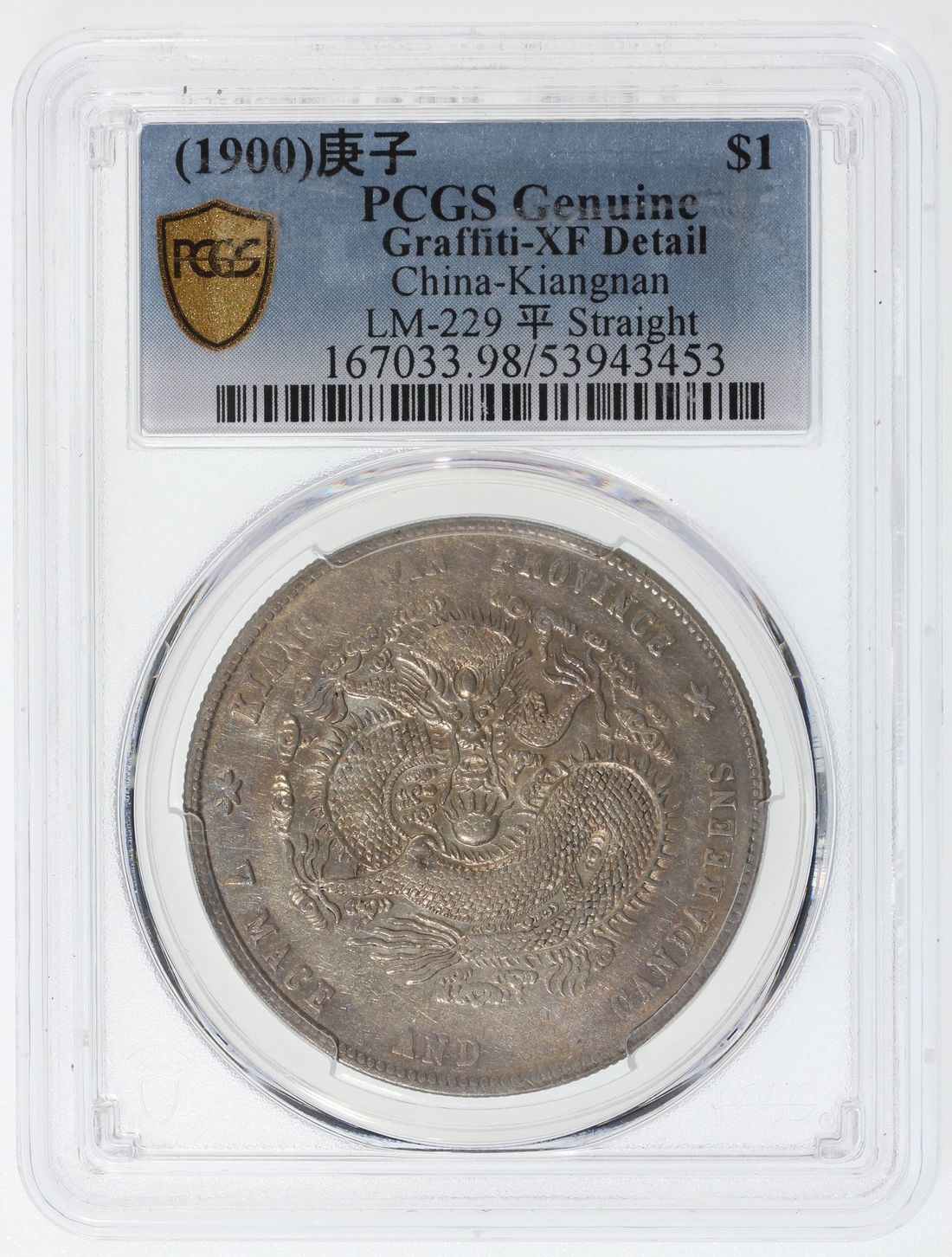 (x) China, Qing Dynasty, Kiangnan Province, [PCGS XF Detail] silver dollar, Gengzi year (1900), "straight 'ping' character stroke" type, (LM-229), graffiti. #53943453. Golden tones on both sides. A less common date for the Kiangnan dollar with lovely overall appearance sans minor graffiti at reverse.