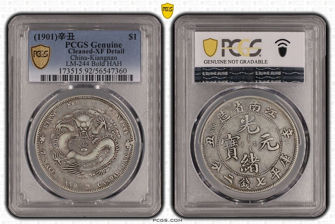 (x) China, Qing Dynasty, Kiangnan Province, [PCGS XF Detail] silver dollar, Xinchou year (1901), 'Guang Xu Yuan Bao', bold 'HAH' at legends on reverse variety, (LM-244, K-90), Cleaned, Cert. #56547360