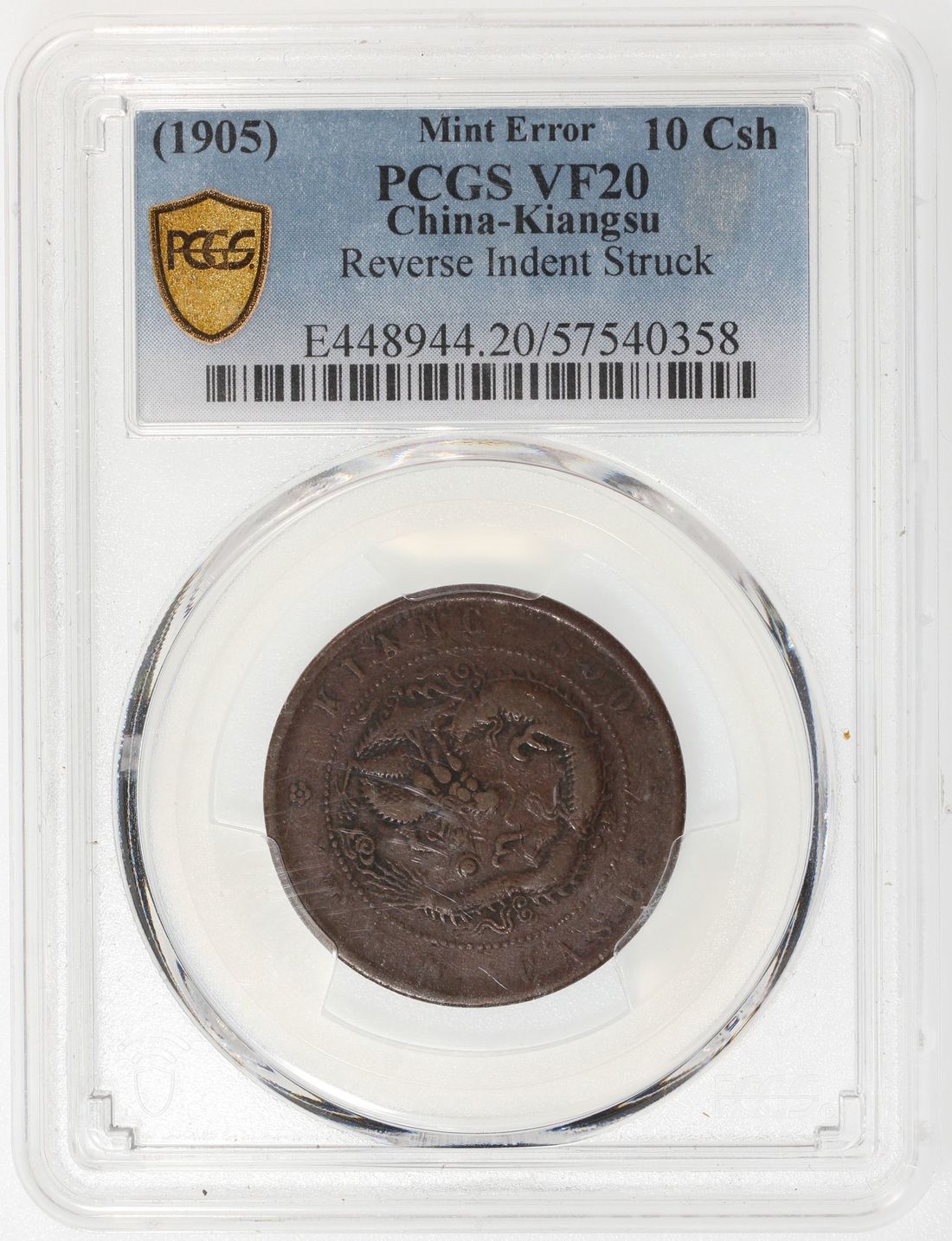 (x) China, Qing Dynasty, Kiangsu Province, [PCGS VF20] MINT ERROR copper 10 cash, Yisi year (1905), 'Guang Xu Yuan Bao', reverse indent struck, (KM-Y-162), Cert. #57540358, a much sought after error among collectors likely caused by misfed planchets entering the collar simultaneously with one overlapping the other