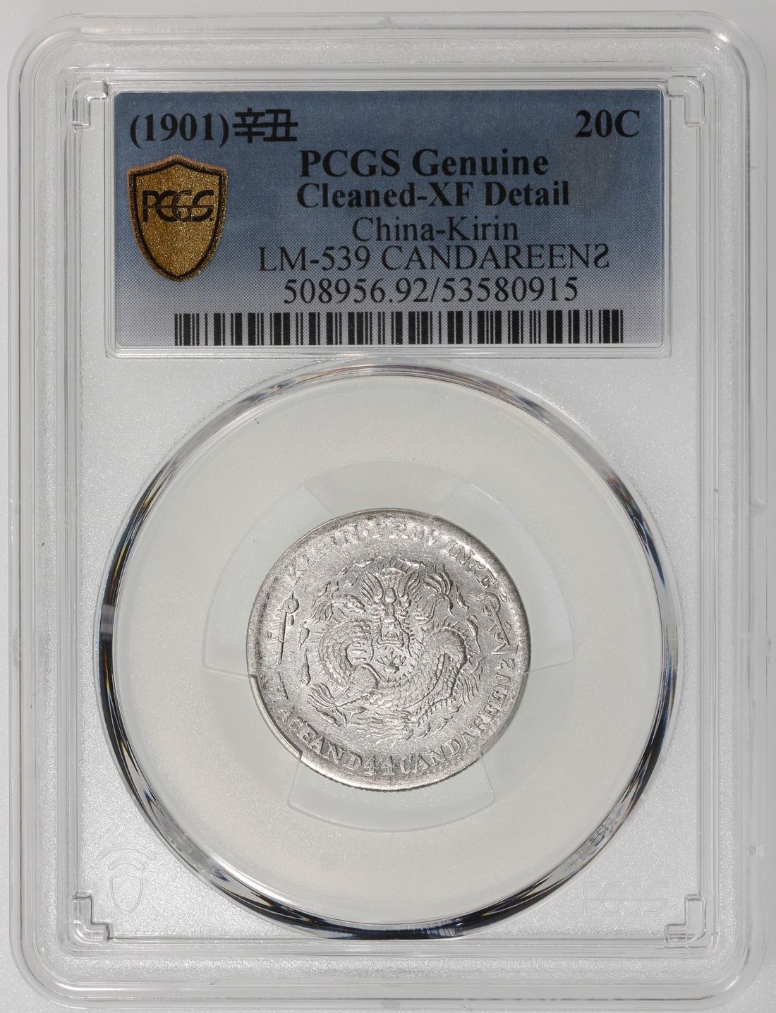 (x) China, Qing Dynasty, Kirin Province, [PCGS XF Detail] silver 20 cents, Xinchou year (1901), 'Guang Xu Yuan Bao', type with laterally inverted 'S' in 'CANDAREENS', (LM-539, K-438a), Cleaned, Cert. #53580915