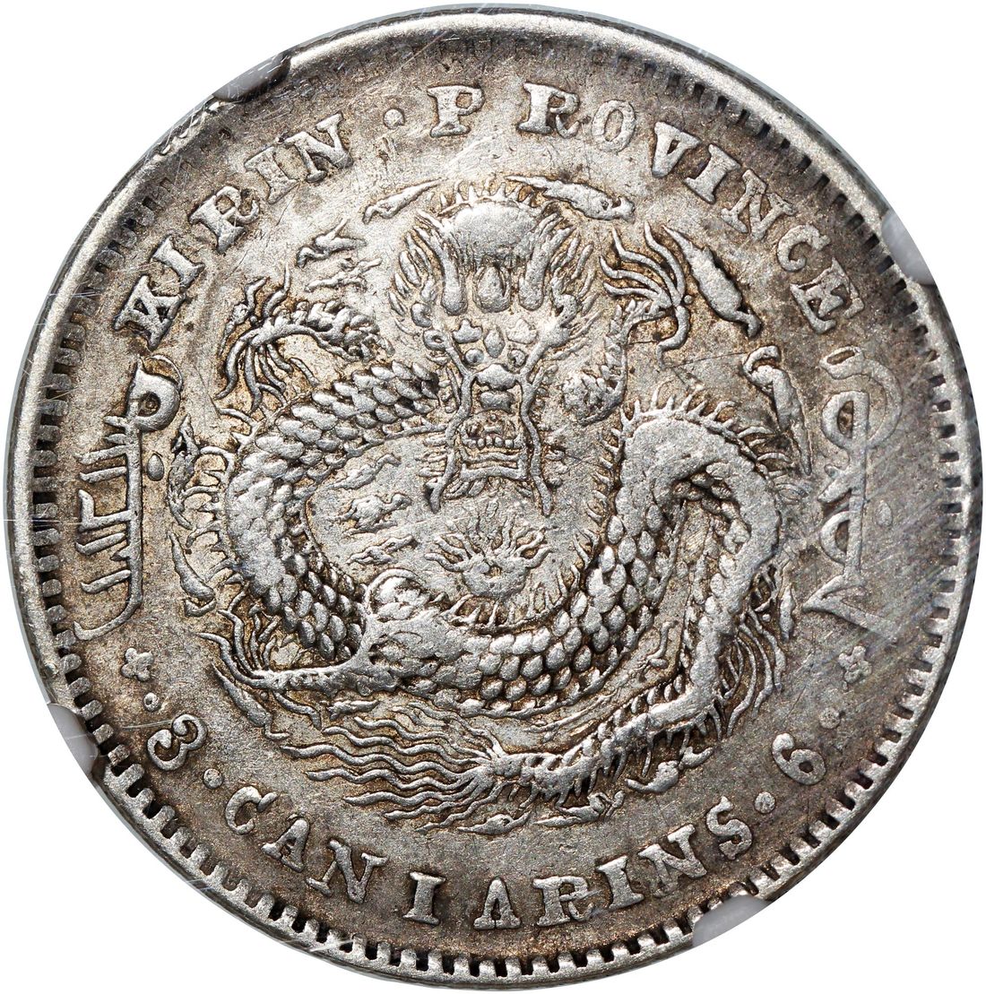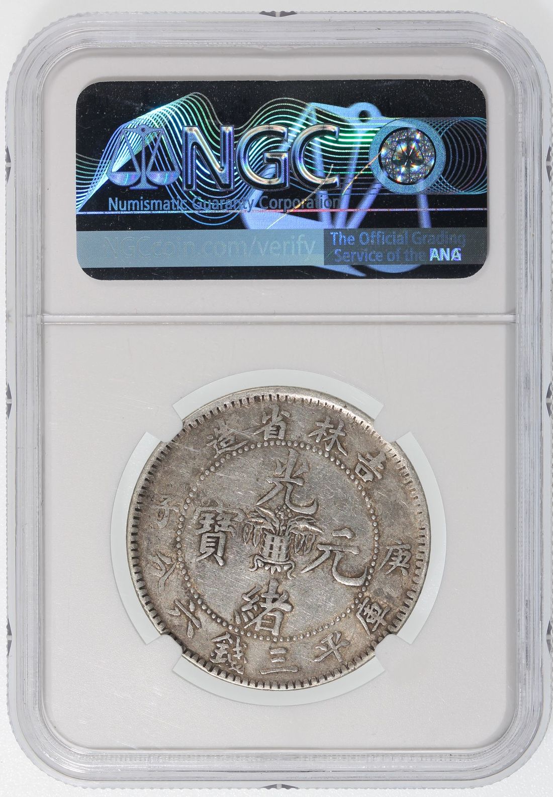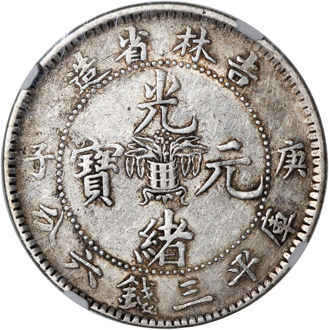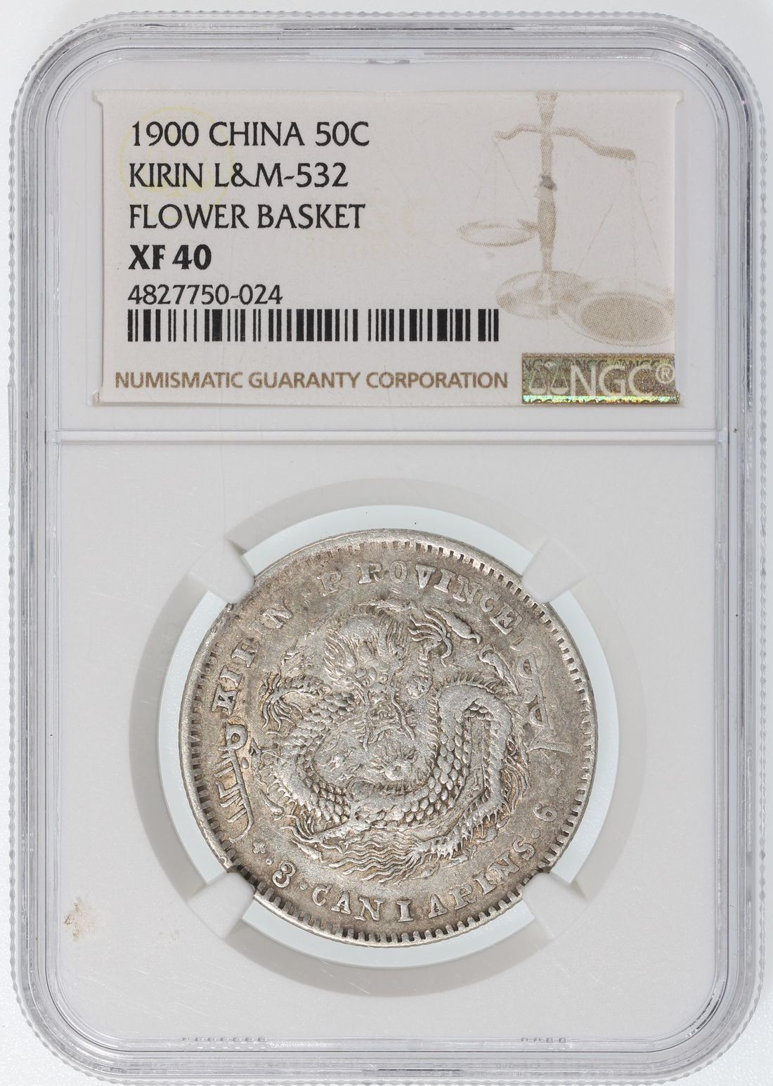 China, Qing Dynasty, Kirin Province, [NGC XF40] silver 50 cents, Gengzi year (1900), 'Guang Xu Yuan Bao', 'Flower Basket' on reverse, (LM-532, K-402), Cert. #4827750-024. The always sought after type, with the flower basket on reverse that has become synonymous with the early Kirin coinage. Though circulated, most details remain. Well respectable example for type