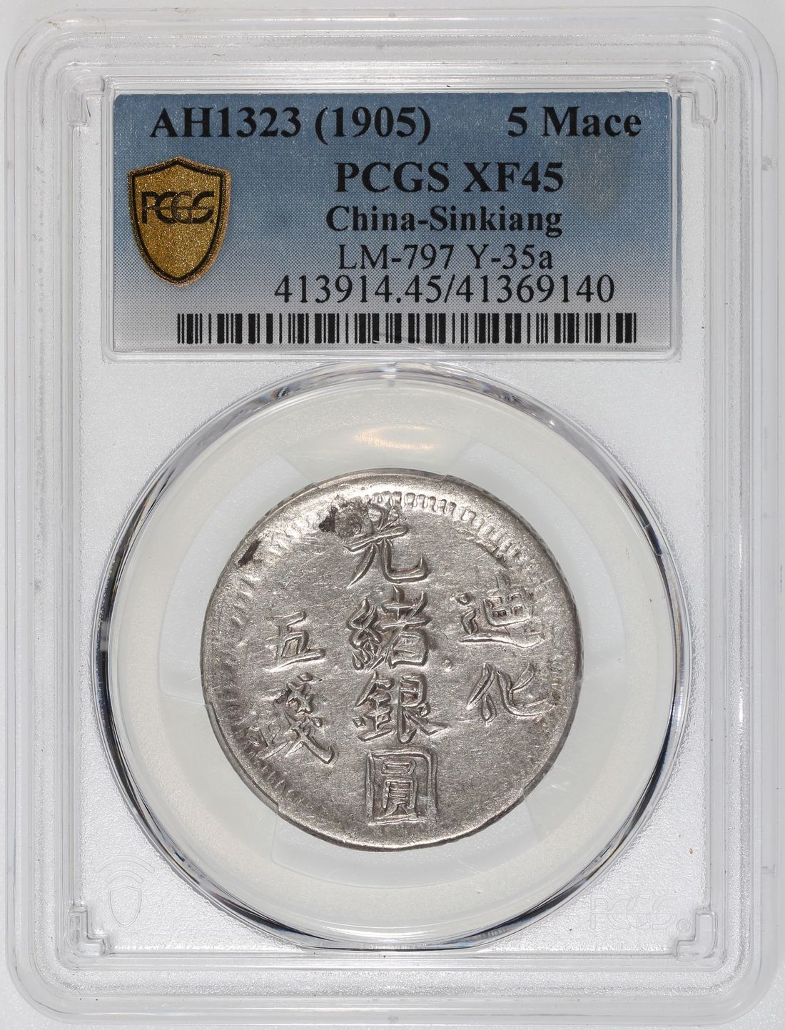 China, Qing Dynasty, Sinkiang Province, [PCGS XF45] silver 5 mace, AH1323 (1905), 'Guang Xu Yin Yuan', Tihwa mint, (LM-797, KM-Y-35a), Cert. #41369140