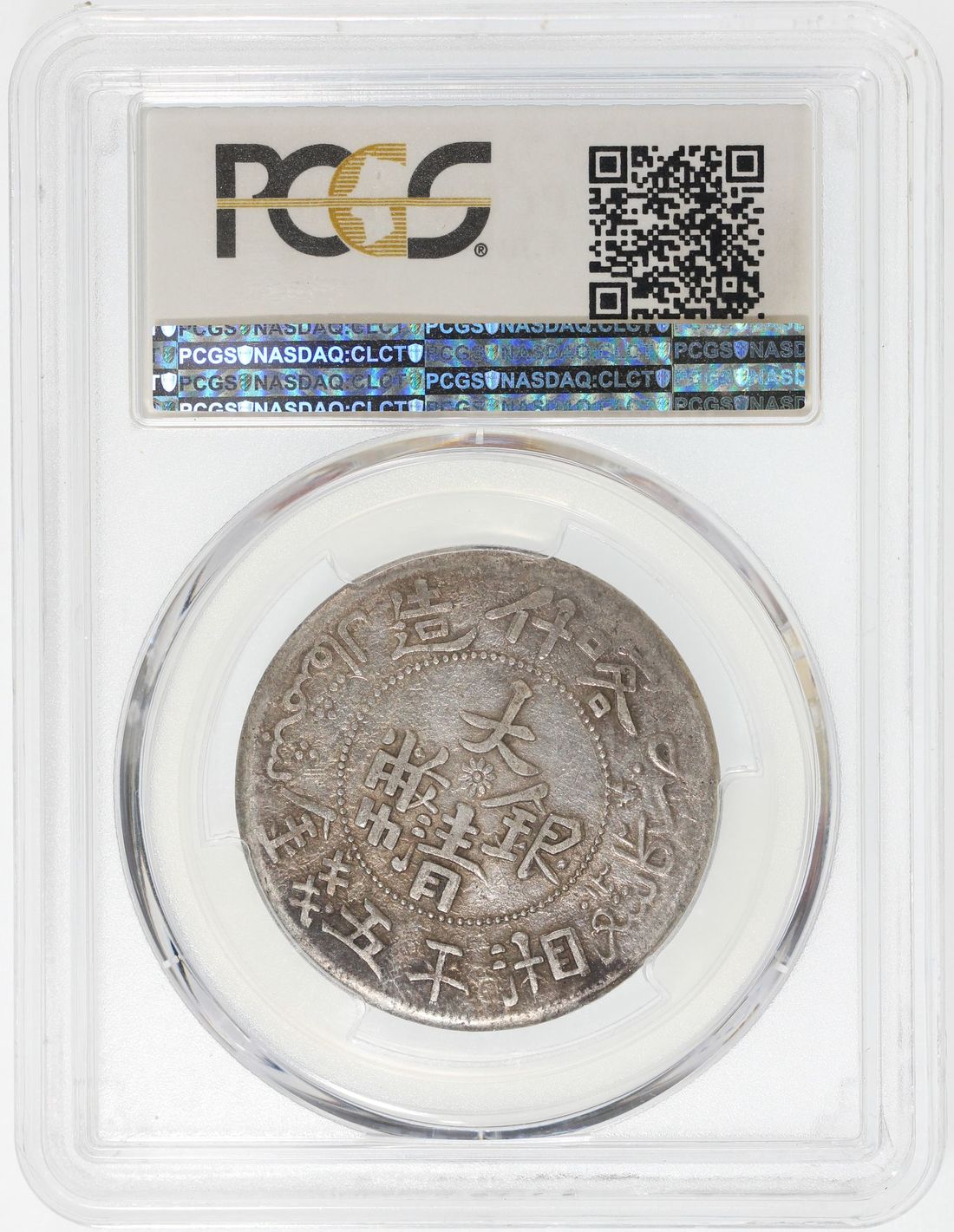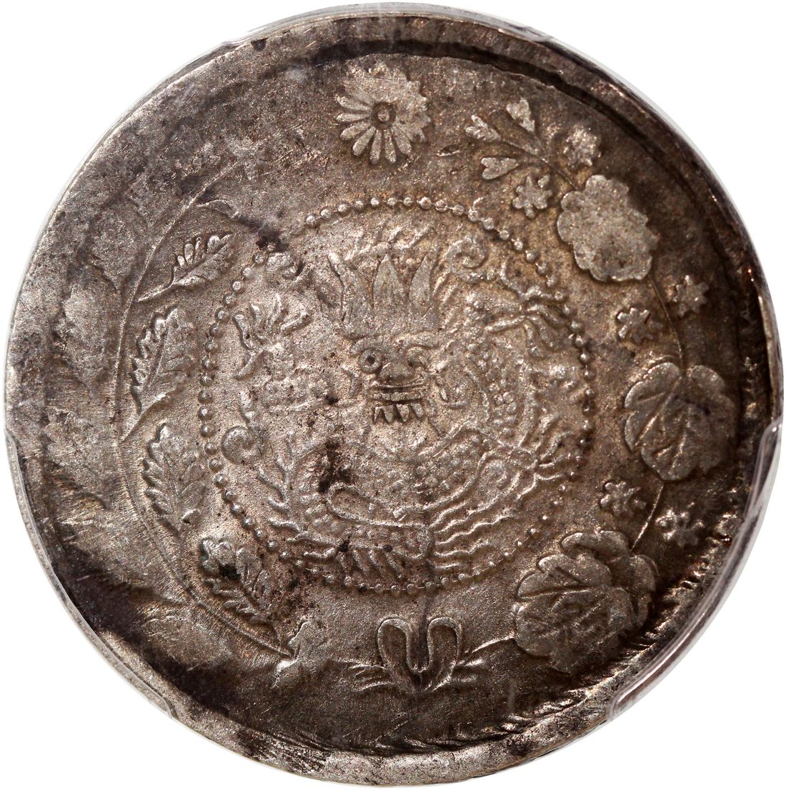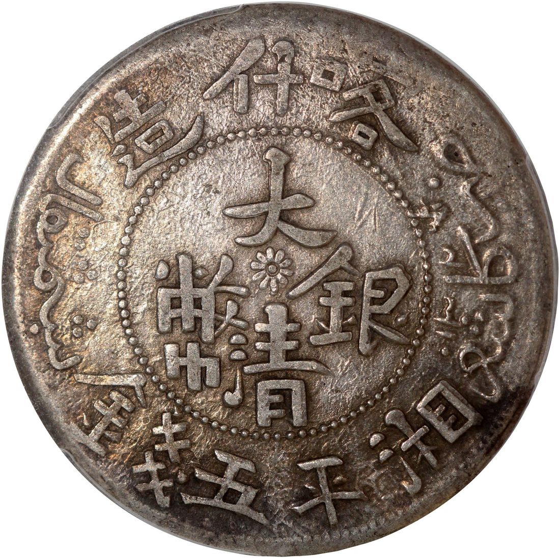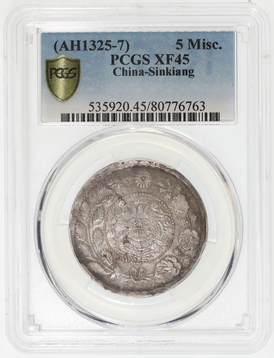 (x) China, Qing Dynasty, Sinkiang Province, [PCGS XF45] silver 5 mace, AH1325-1327 (1907-1909), 'Da Qing Yin Bi', Kashgar mint, big leaves on left side of wreath, (KM-Y-25), Cert. #80776763. The highest graded example among the ones with illegible date