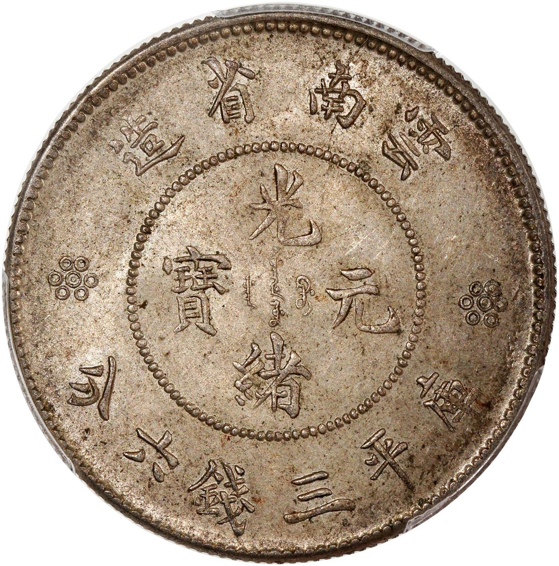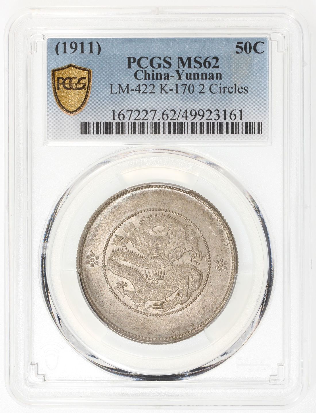 (x) China, Qing Dynasty, Yunnan Province, [PCGS MS62] silver 50 cents, ND (1911), 'Guang Xu Yuan Bao', new dragon, two circles below fiery pearl, extra long claws at right variety, Manchurian text on reverse with dot at right, beaded circle on obverse connected, (LM-422, K-170), Cert. #49923161. Interesting sub-type