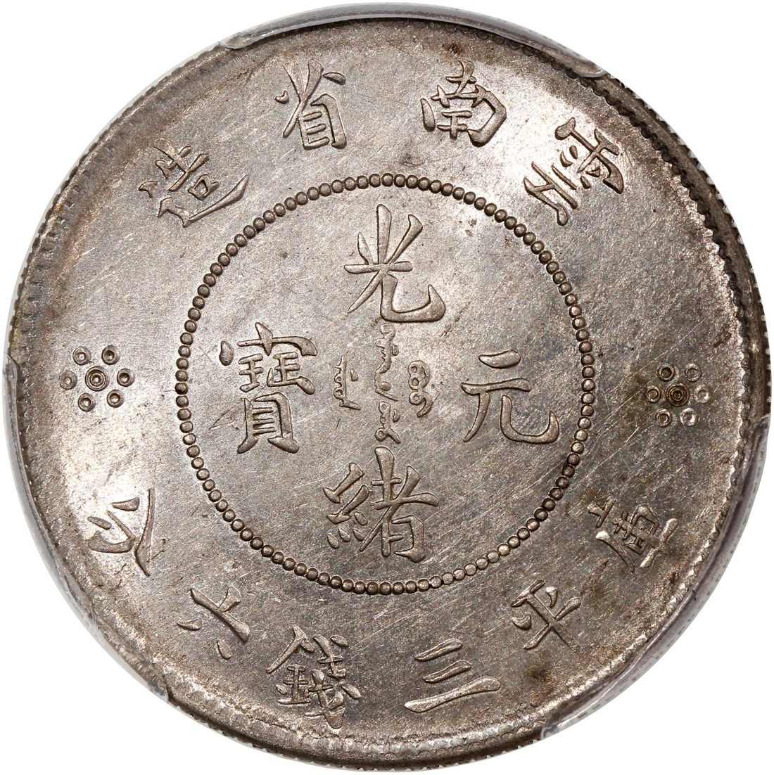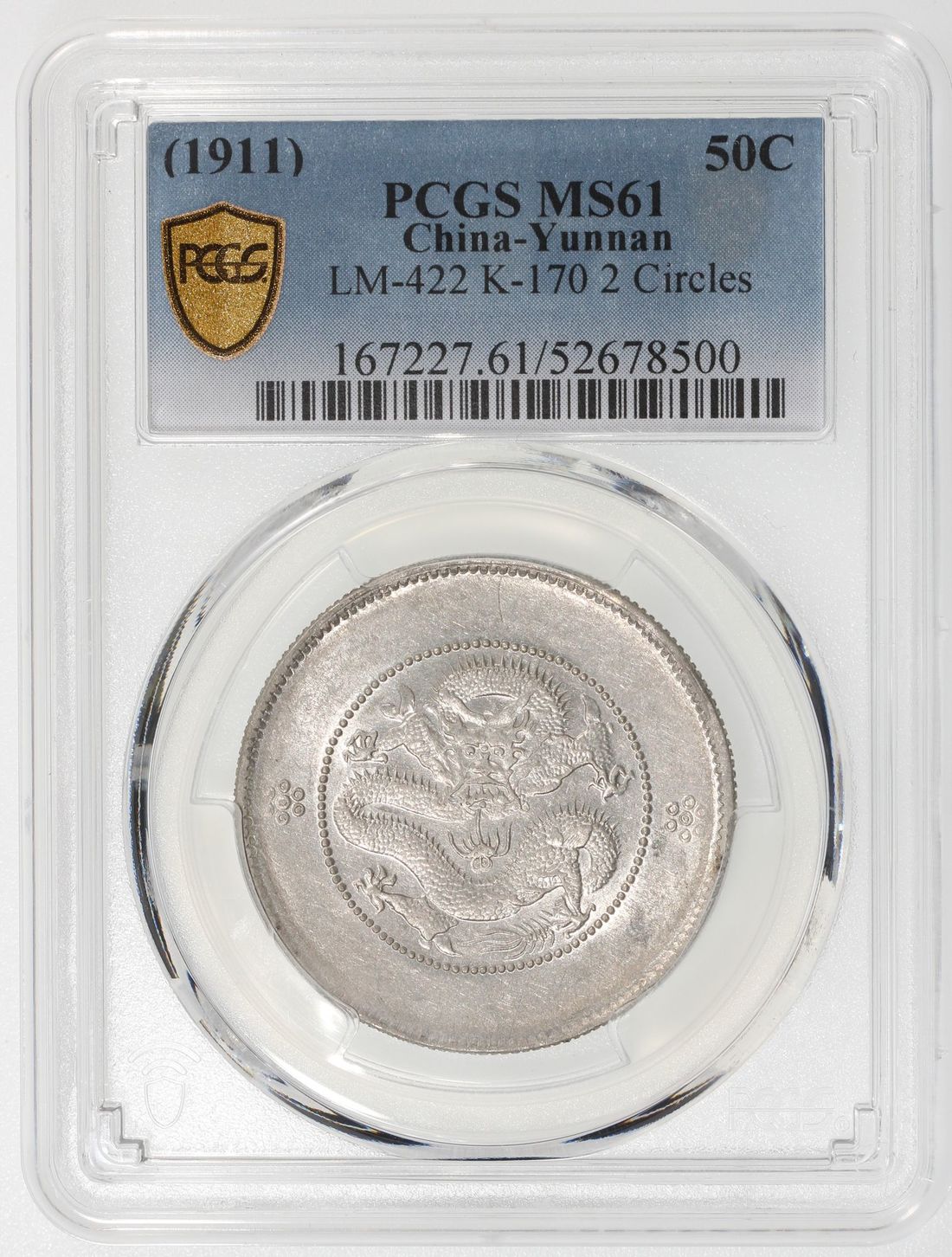 (x) China, Qing Dynasty, Yunnan Province, [PCGS MS61] silver 50 cents, ND (1911), 'Guang Xu Yuan Bao', new dragon, 'snake-head pearl' with a side grin variant, (LM-422, K-170), Cert. #52678549. The 'side grin' sub-type appears almost comical and deranged. Interesting sub-type. A 'snake-head pearl' variant without the side grin hammered for 3500HKD at Spink in October 2025