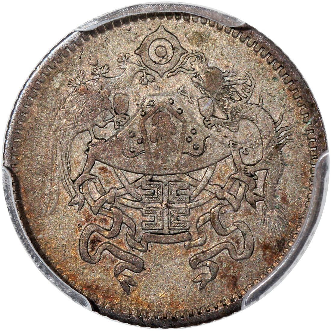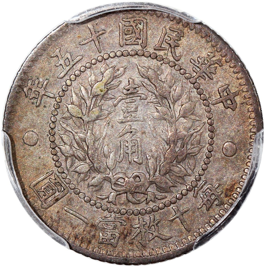 China, Republic, [PCGS AU53] silver 10 cents, Year 15 (1926), 'dragon and phoenix', (LM-83, KM-Y-334), Cert. #37077616, muted pewter toning with flashes of red near the bottom