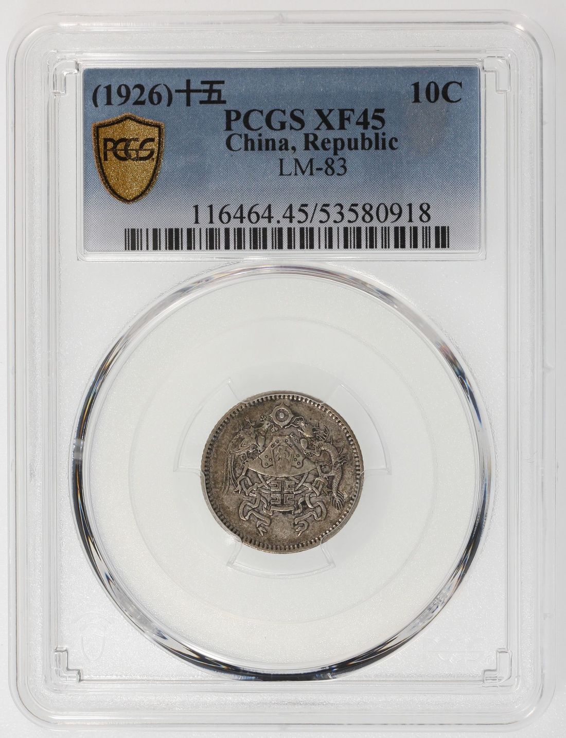 (x) China, Republic, [PCGS XF45] silver 10 cents, Year 15 (1926), 'dragon and phoenix', (LM-83, KM-Y-334), Cert. #53580918, a nice original example of this popular single year issue