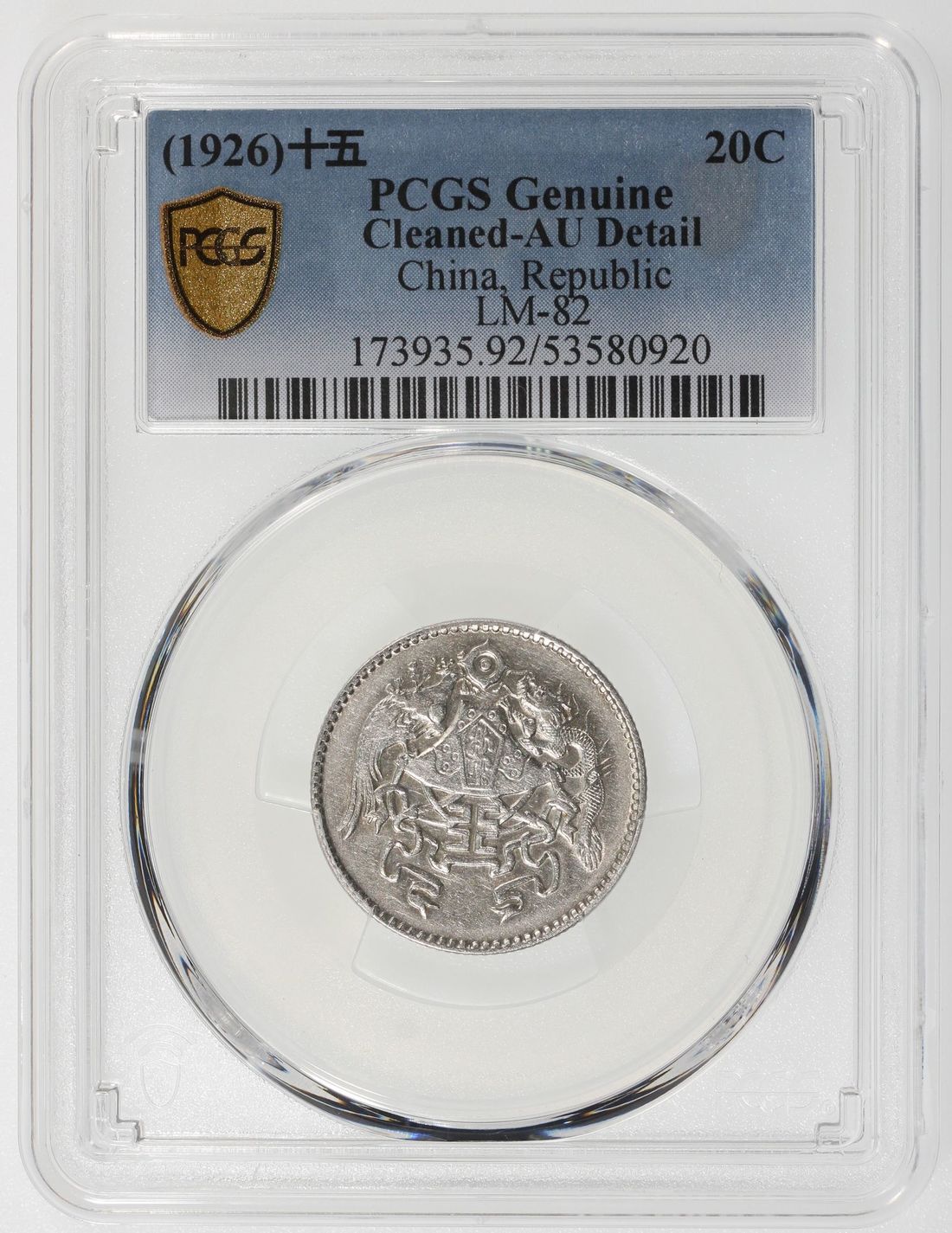 (x) China, Republic, [PCGS AU Detail] silver 20 cents, Year 15 (1926), 'dragon and phoenix', (LM-82, KM-Y-335), Cleaned Cert. #53580920