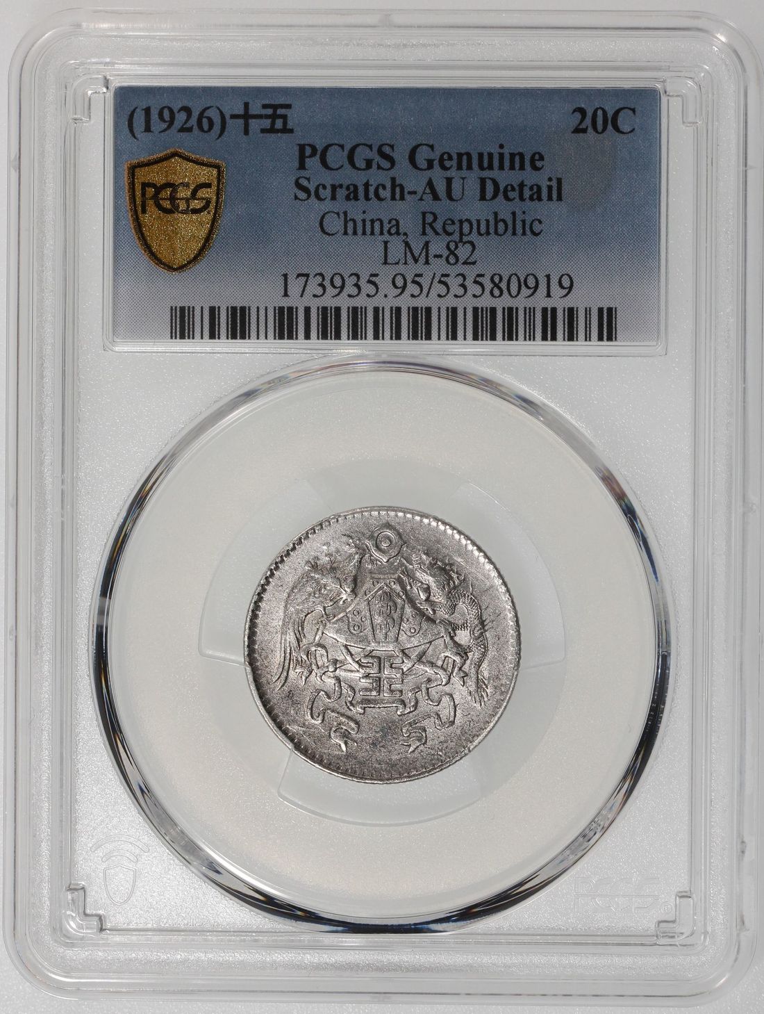 (x) China, Republic, [PCGS AU Detail] silver 20 cents, Year 15 (1926), 'dragon and phoenix', (LM-82, KM-Y-335), Scratch. Cert. #53580919