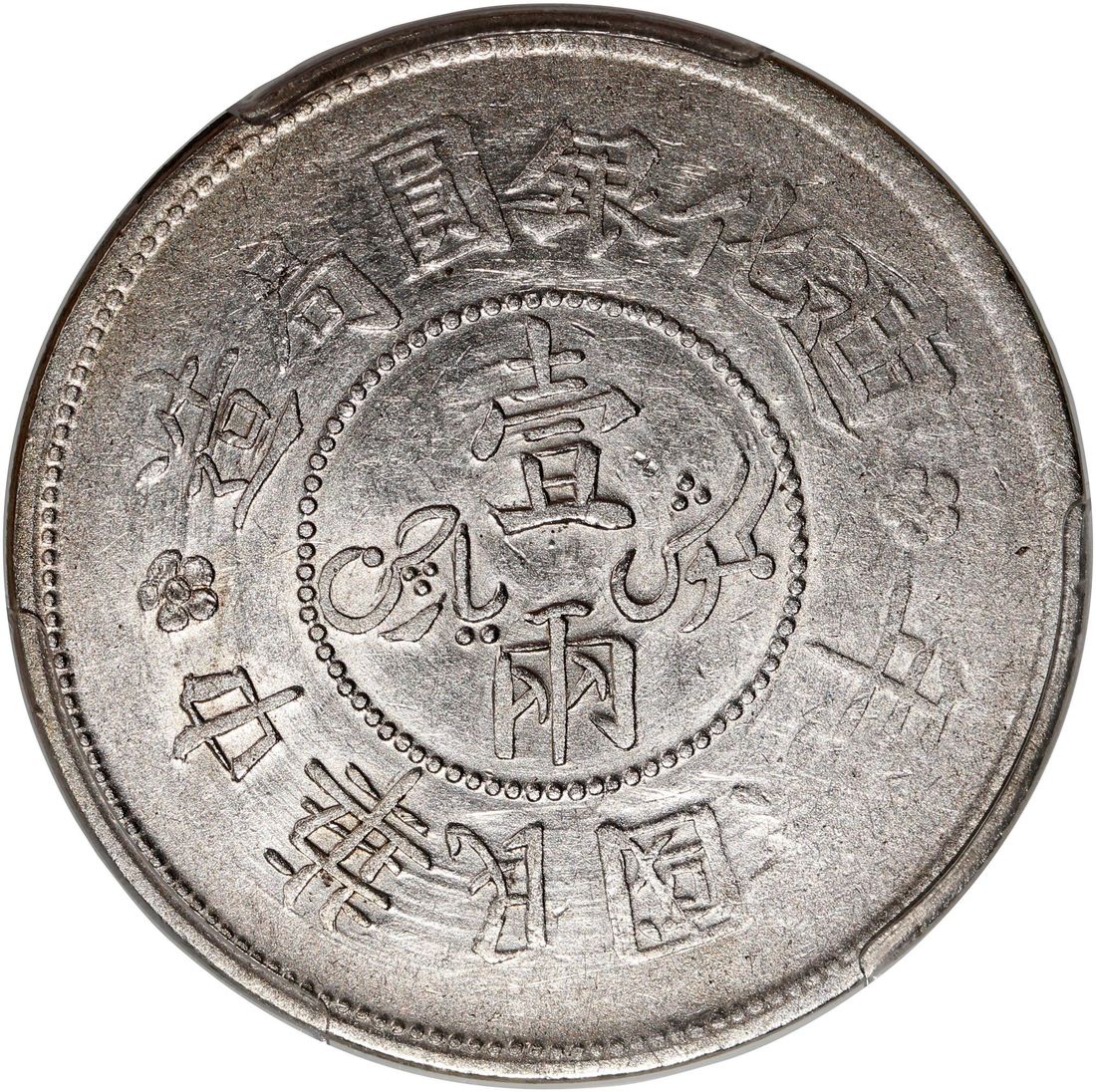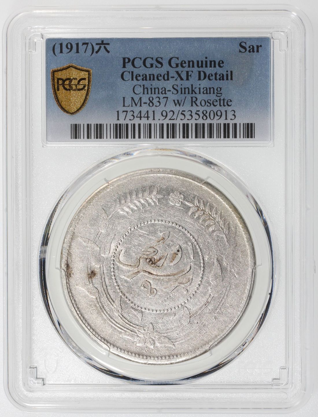 (x) China, Republic, Sinkiang Province, [PCGS XF Detail] silver sar (tael), Year 6 (1917), Tihwa mint, with rosette at top, (LM-838, KM-Y-45.1), Cleaned, Cert. #53580913