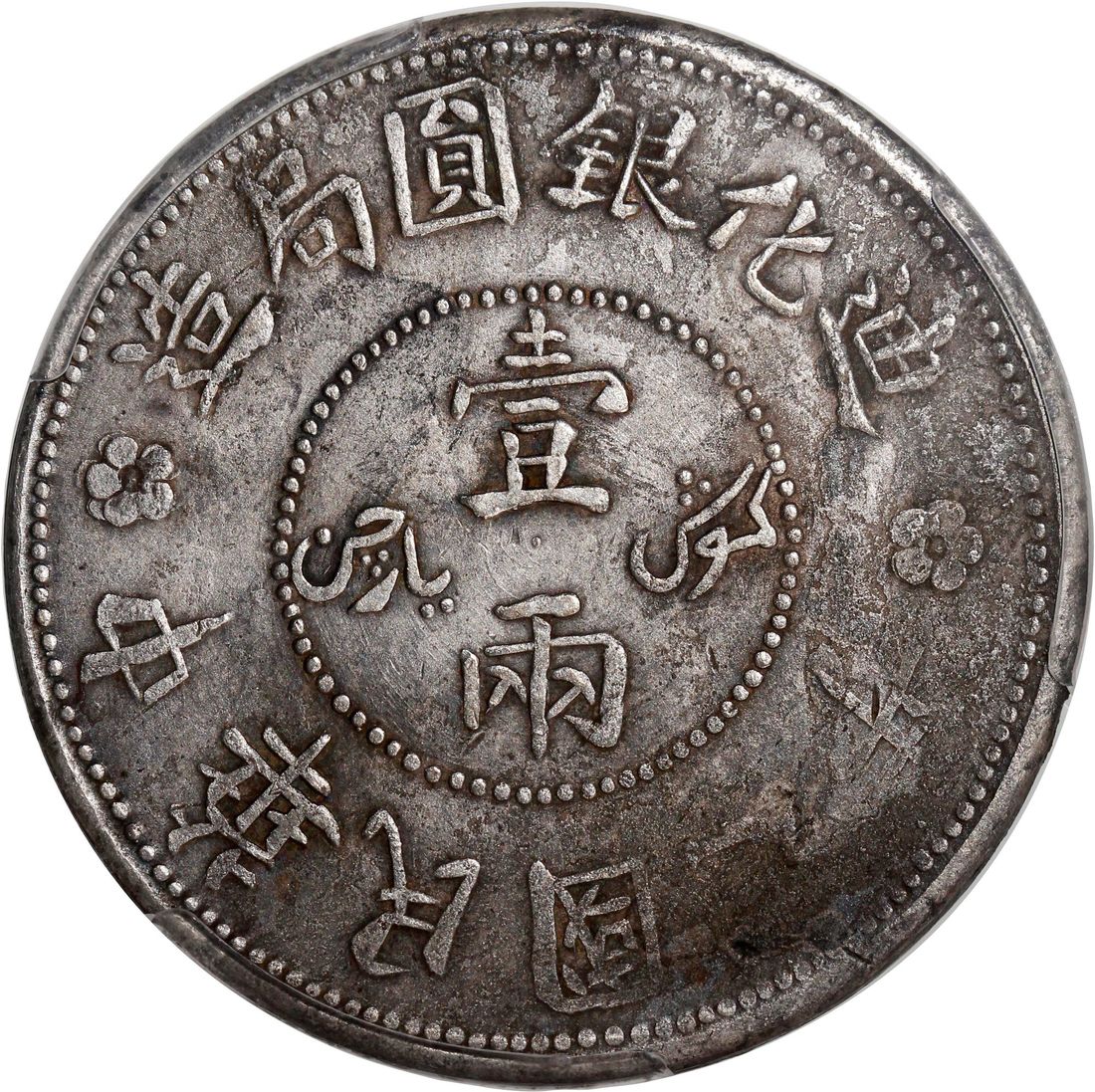 (x) China, Republic, Sinkiang Province, [PCGS AU Detail] silver sar (tael), Year 7 (1918), Tihwa mint, with rosette at top and ornate branches on obverse, (LM-839, KM-Y-45.2), Harshly Cleaned, Cert. #53580911