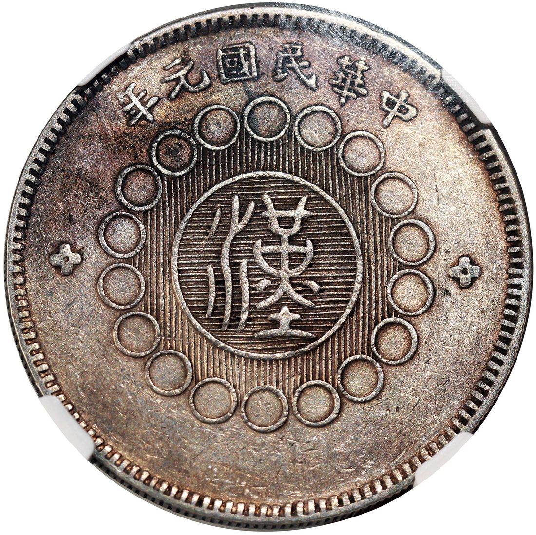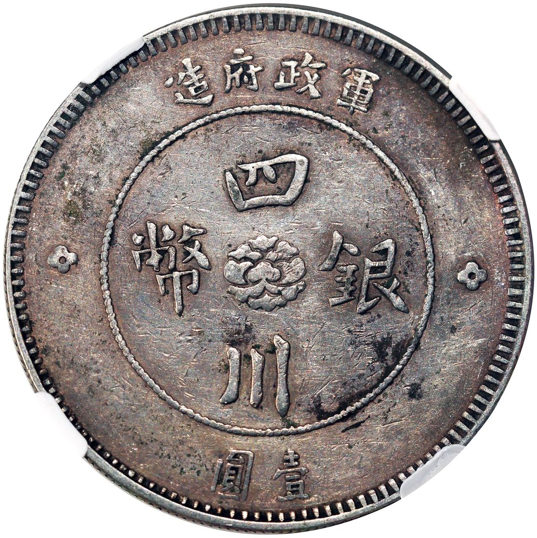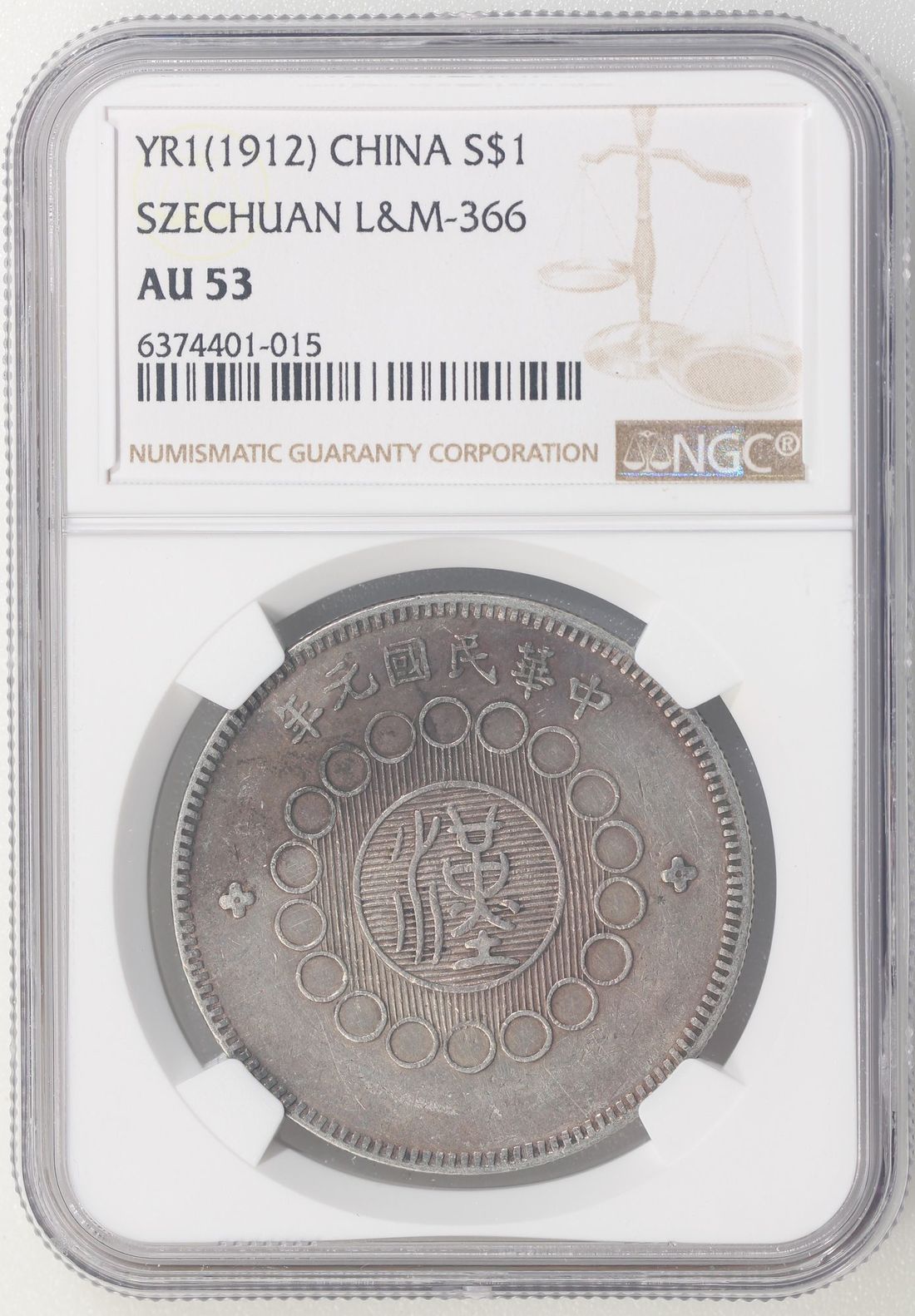 China, Republic, Szechuan Province, [NGC AU53] silver dollar, Year 1 (1912), Military Government issue, Chinese character 'Han' in seal script on obverse, regular type where the dots of the Chinese character 'Yin' are connected, (KM-Y-454, LM-366), Cert. #6374401-015