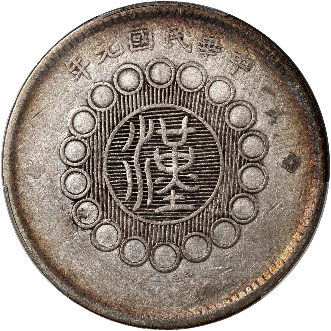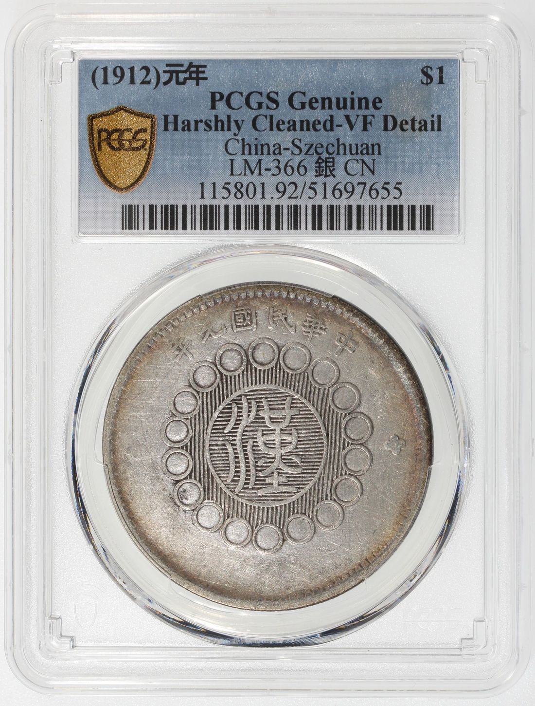 (x) China, Republic, Szechuan Province, [PCGS VF Detail] silver dollar, Year 1 (1912), Chinese character 'Han' in seal script on obverse, Military issue, Chinese character 'Yin' connected, slanted dot in Chinese character 'Nian' variety, (LM-366),