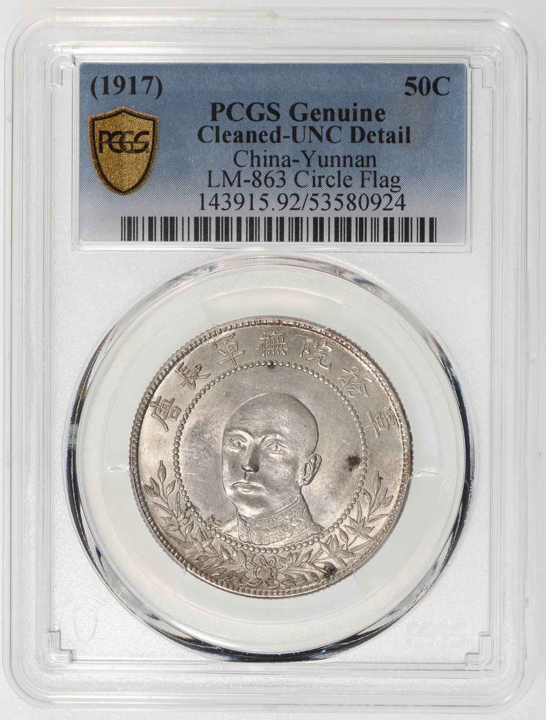 (x) China, Republic, Yunnan Province, [PCGS UNC Detail] silver 50 cents, ND (1917), three quarter profile of Tang Ji Yao, circle at center of left flag variety, (LM-863), Cleaned, Cert. #53580924